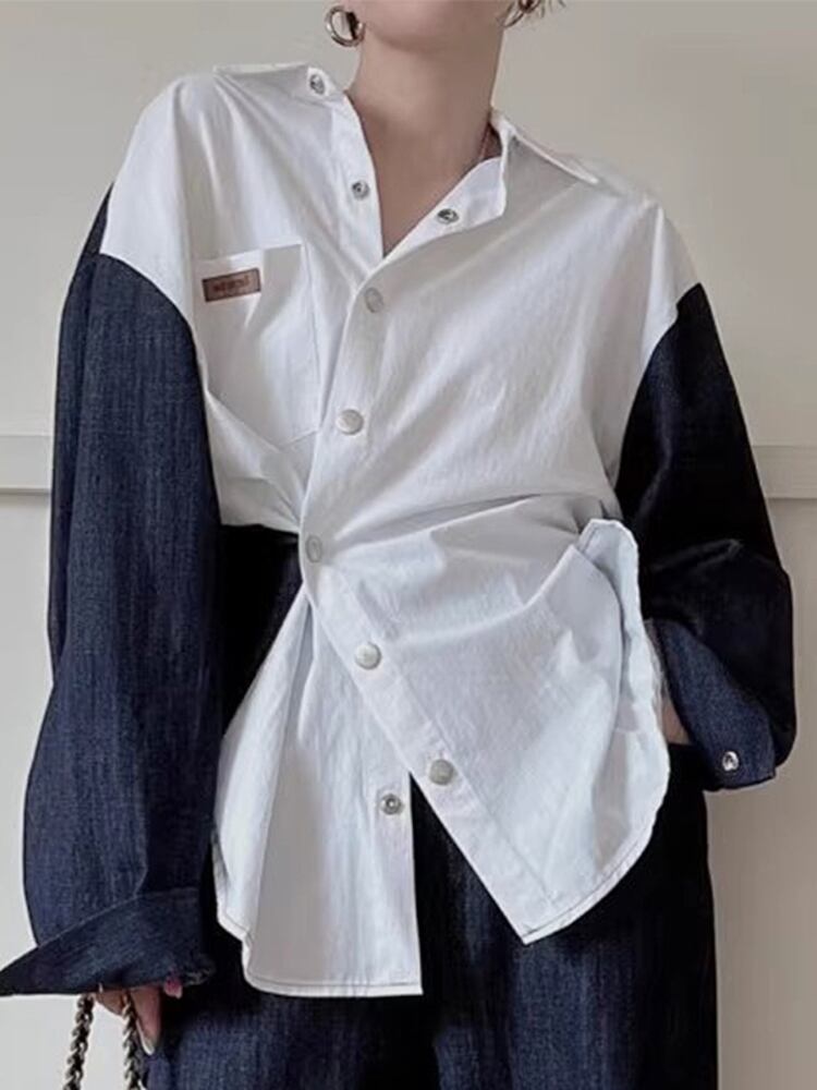 [EWQ] メタルボタンラペルシャツレディース長袖デニムパッチワークルーズシック秋冬潮16U3915 ロング オータム 秋物 ウィンター 冬物