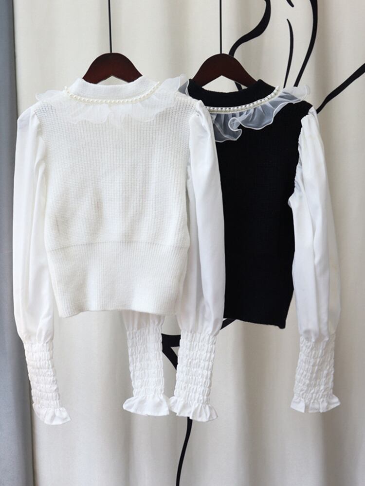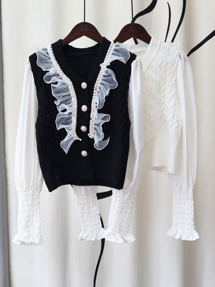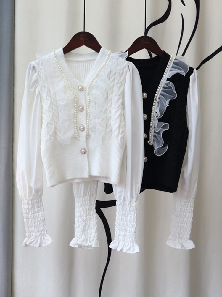 [EWQ] シックバージョン コントラスト パッチワーク フリル ニット カーディガン ジャケット コート セーター レディース 秋 ホワイト オータム 秋物