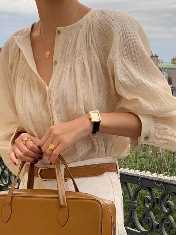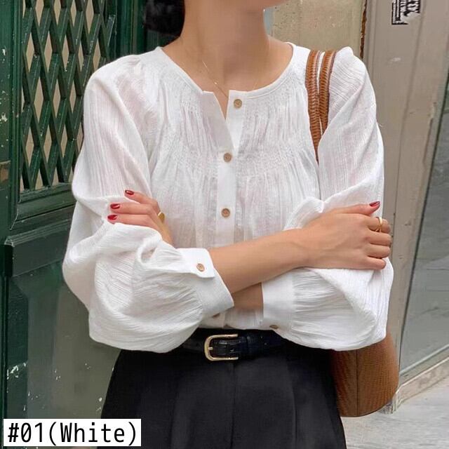 [EWQ] O ネックシングルブレストシャツ長袖ルーズ白プリーツ秋冬潮トップ 16U3930 ロング ホワイト オータム 秋物 ウィンター 冬物 Oネック