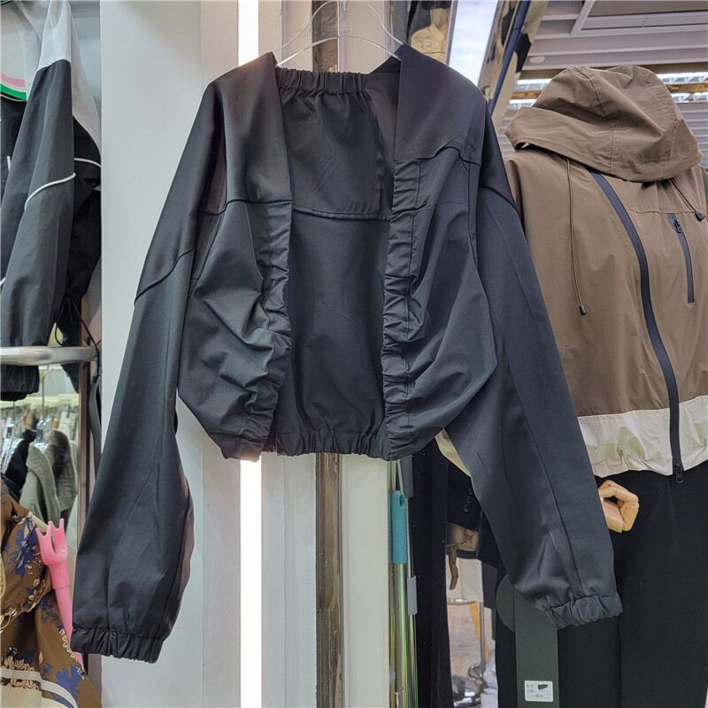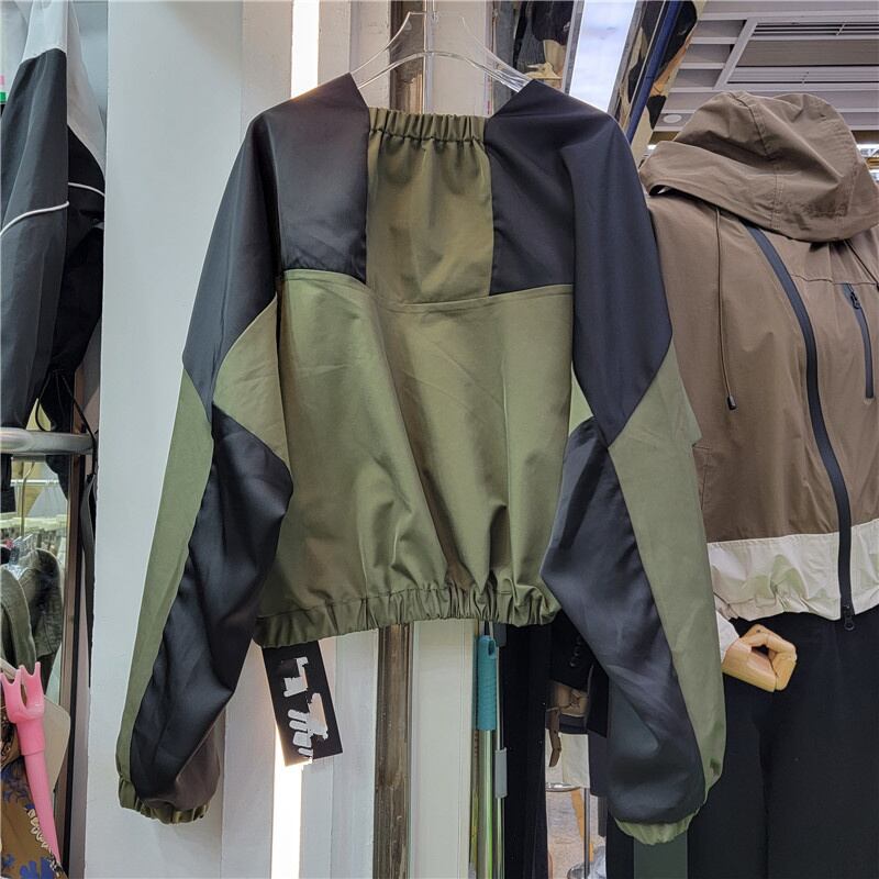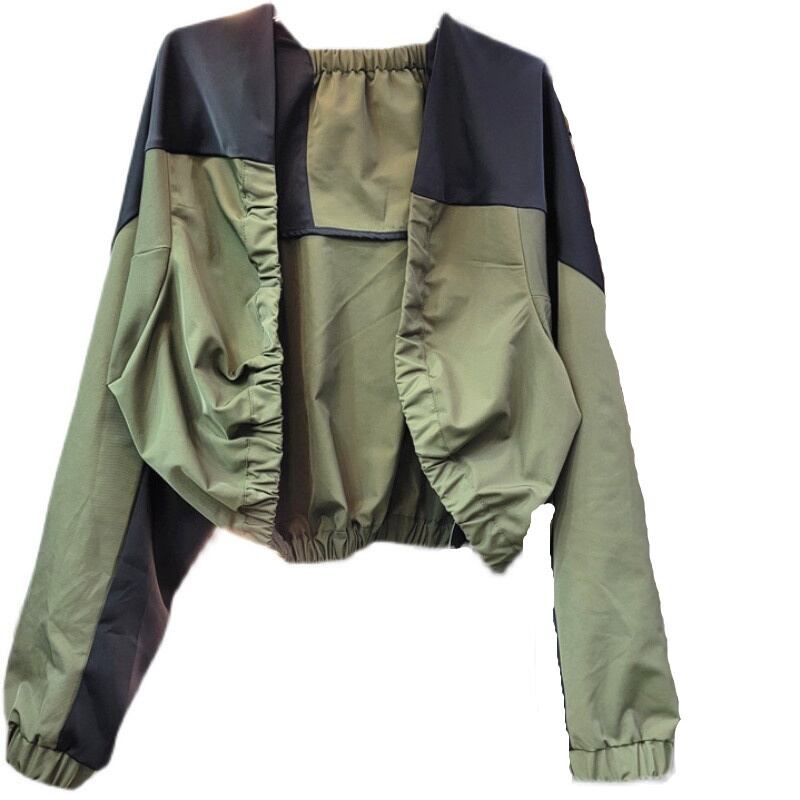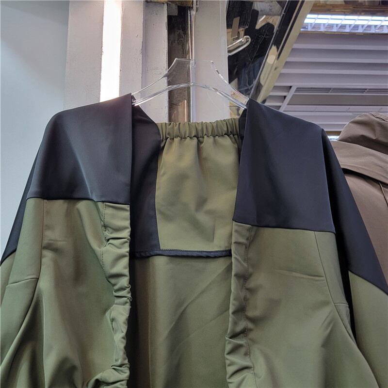 [EWQ] O ネックパッチワーク裾弾性ジャケットオープンステッチ長袖ルーズグリーンコート秋ヨーロッパアウター 16U3970 ロング エラスティック 伸縮 オータム 秋物 Oネック