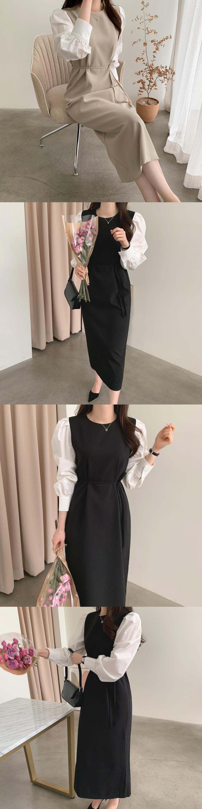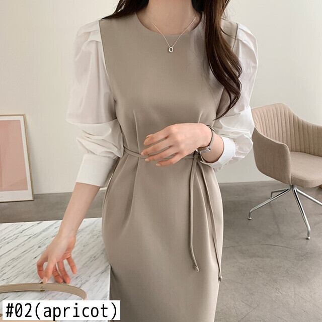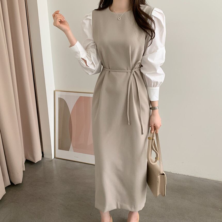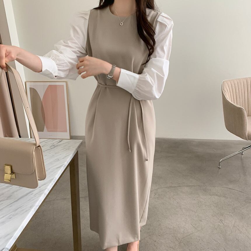 [EWQ] シックラウンドネックコントラストカラーステッチパフスリーブ美しいドレス秋冬 Vestidos Y30 オータム 秋物 ウィンター 冬物 Oネック