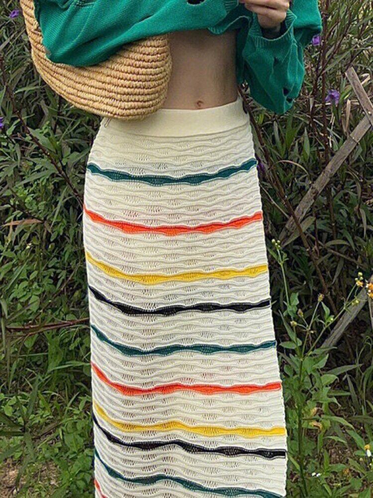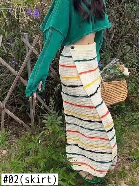 [EWQ] レインボーストライプニットスカートウエストサイド 1 ボタンミッドカーフスカート甘い秋トレンド Faldas 大人ガーリー スウィート キュート カジュアル オータム 秋物