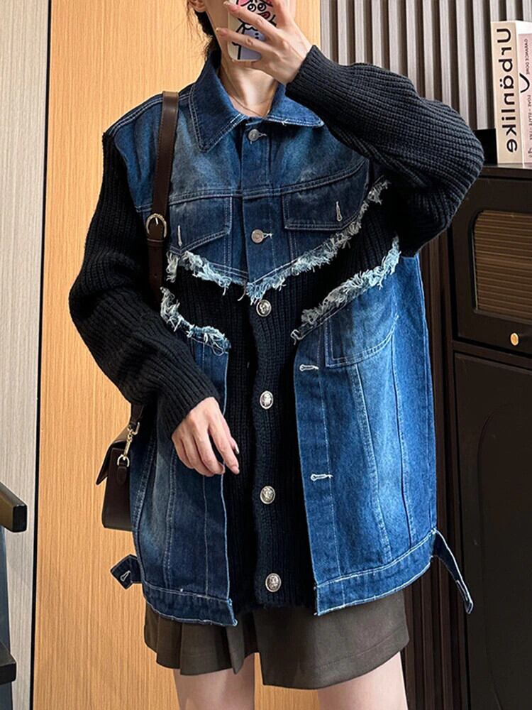 [EWQ] ストリートラペルテルデニムパッチワークセーターカーディガンジャケットシングルブレストコート秋 16O482 オータム 秋物
