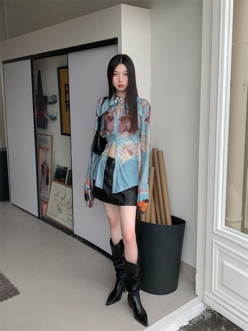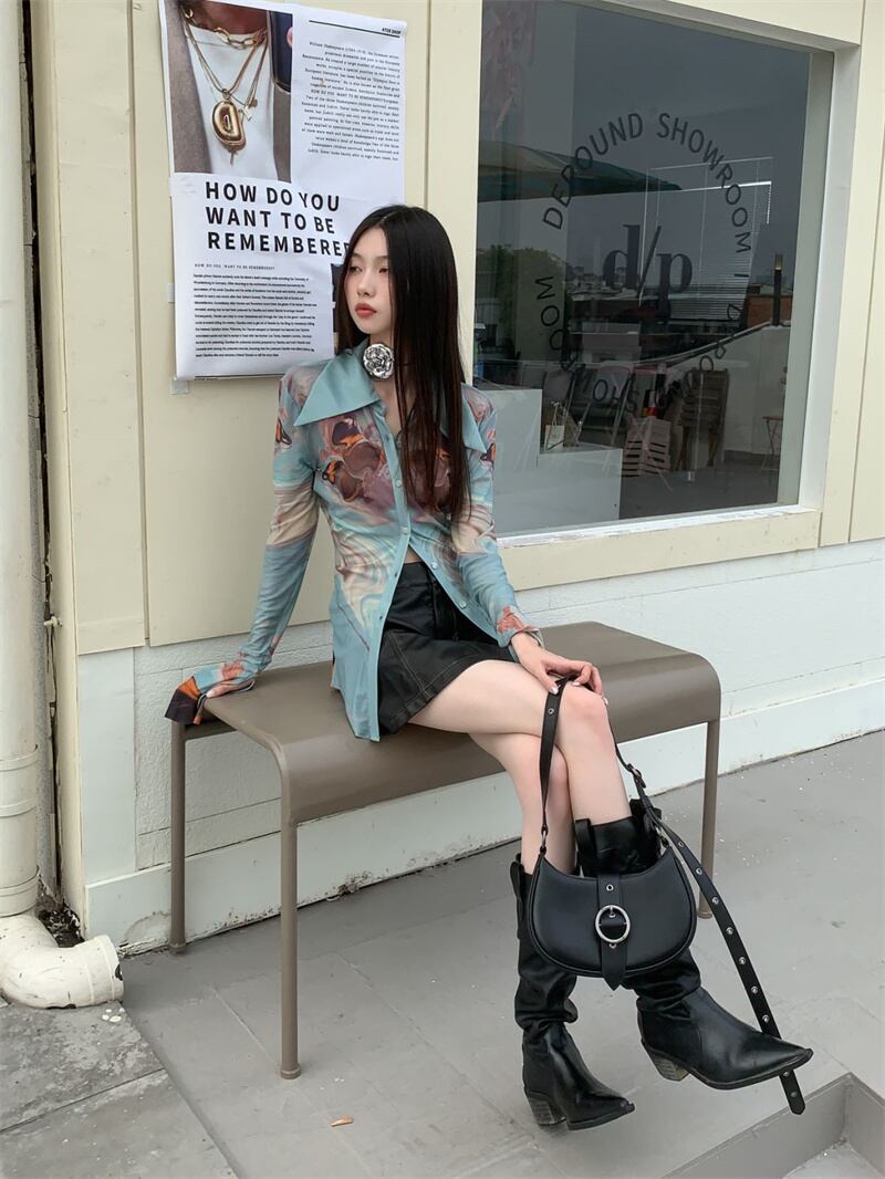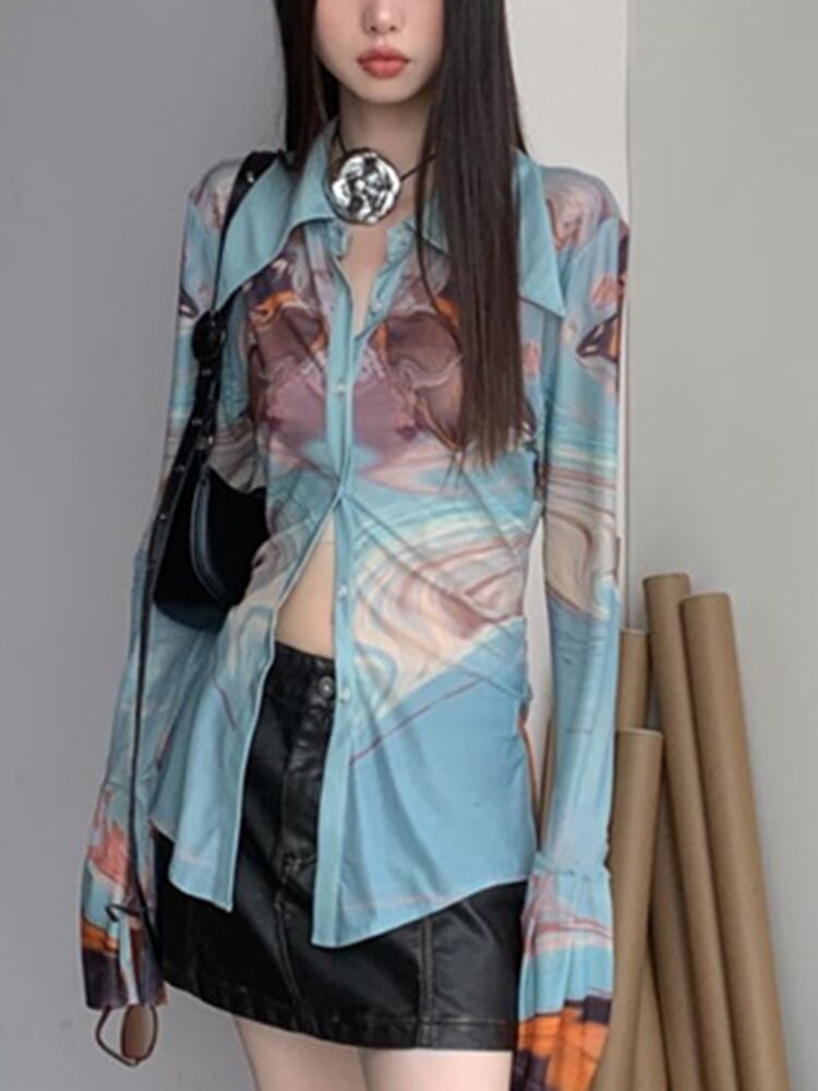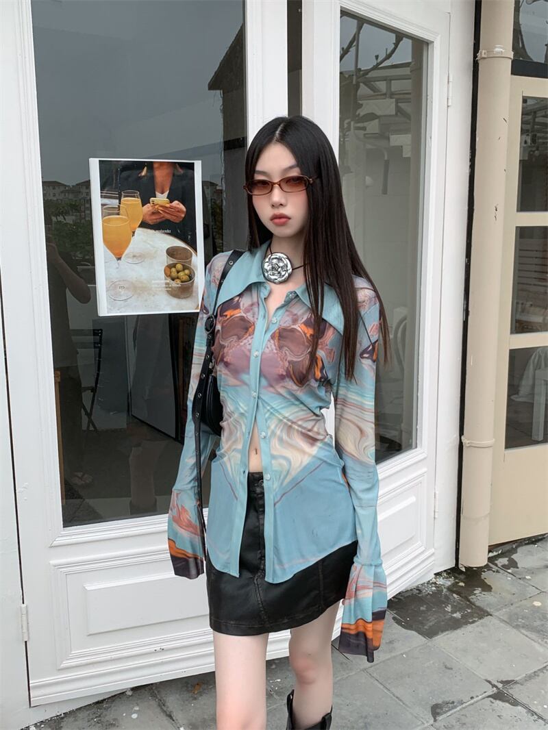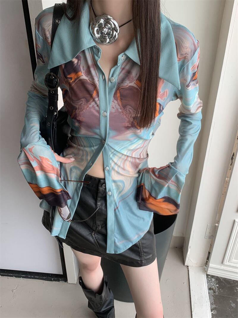 [EWQ] プリントコントラストシャツ秋薄手長袖シングルブレストスリムタイドラペルブラウス 16U2483 ロング オータム 秋物