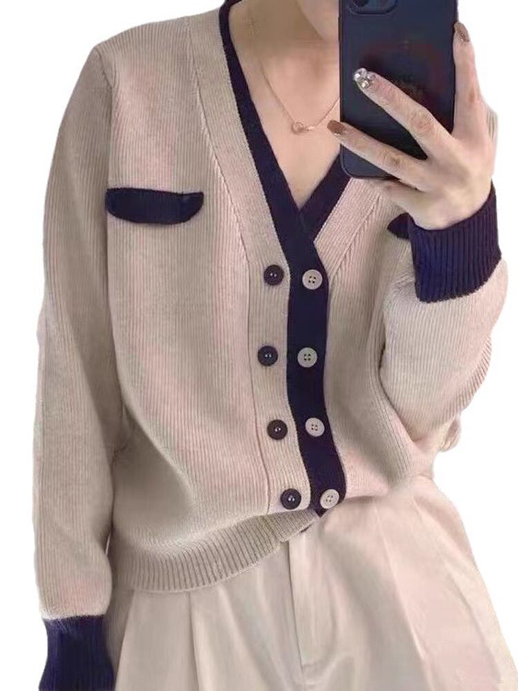 [EWQ] ダブルブレストコントラストルーズカーディガンコート長袖 V ネックセータージャケット秋薄手服 ロング オータム 秋物 Vネック
