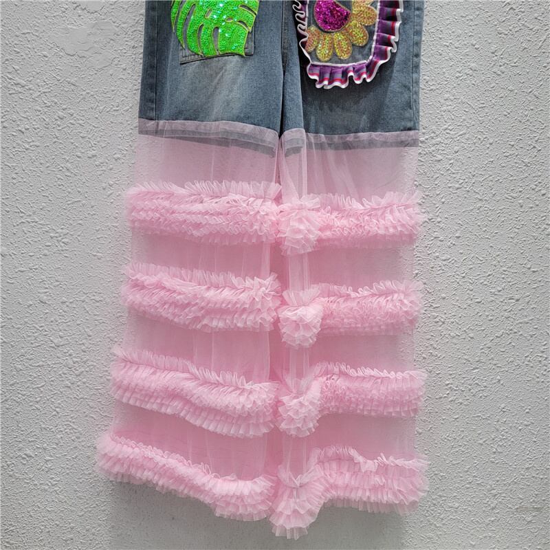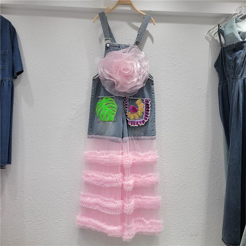 [EWQ] 3D メッシュフラワーピンクパッチワークストラップデニムパンツストリート裾ガーゼ透視オーバーオールジーンズ夏 U683 サマー 夏物 フラワーデザイン