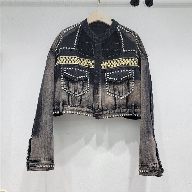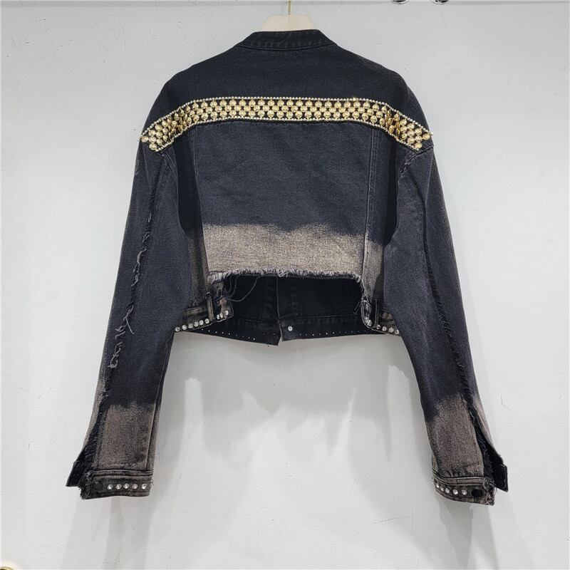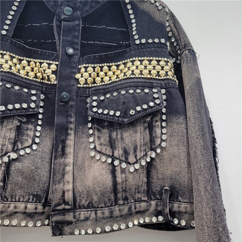 [EWQ] ダイヤモンド中空アウトデニムジャケット長袖パッチワークヒップホップジャケット秋潮長袖バリコート ロング オータム 秋物