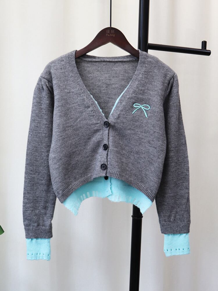 [EWQ] フェイクツーピースパッチワークカーディガンコート長袖コントラストネクタイルーズショートセータージャケット秋 16U3236 ロング オータム 秋物