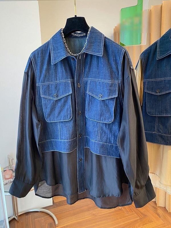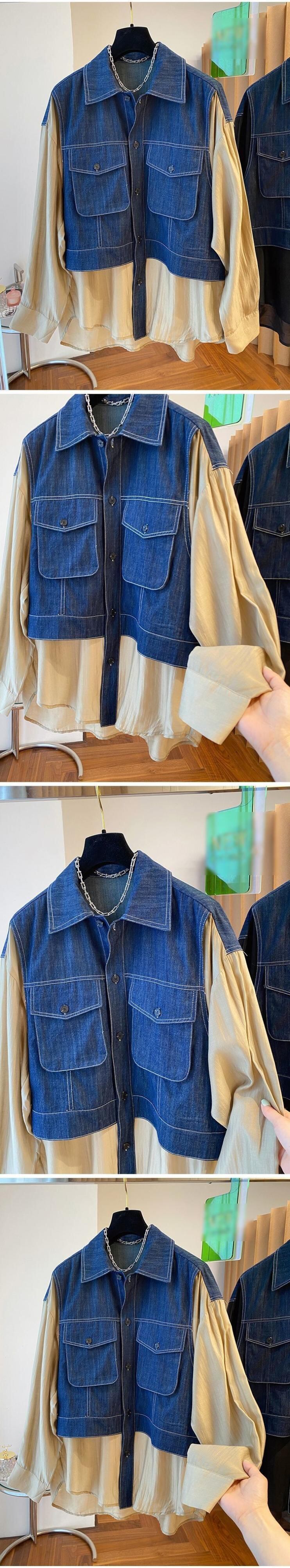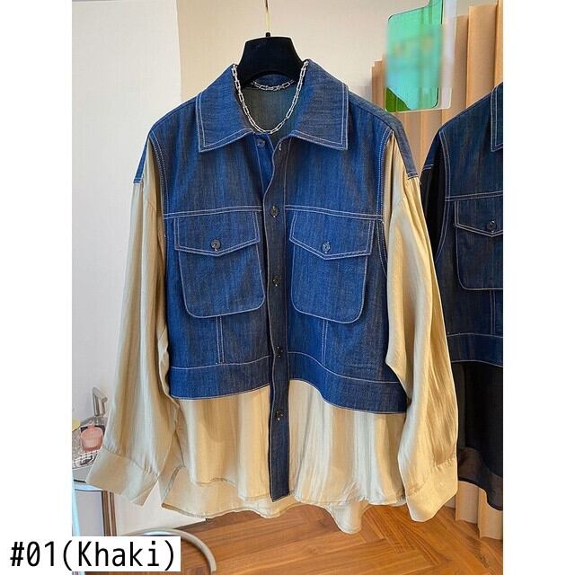 [EWQ] デニムスプライスシャツフェイクツーピースコントラストビッグサイズ長袖秋潮トップ ロング オータム 秋物