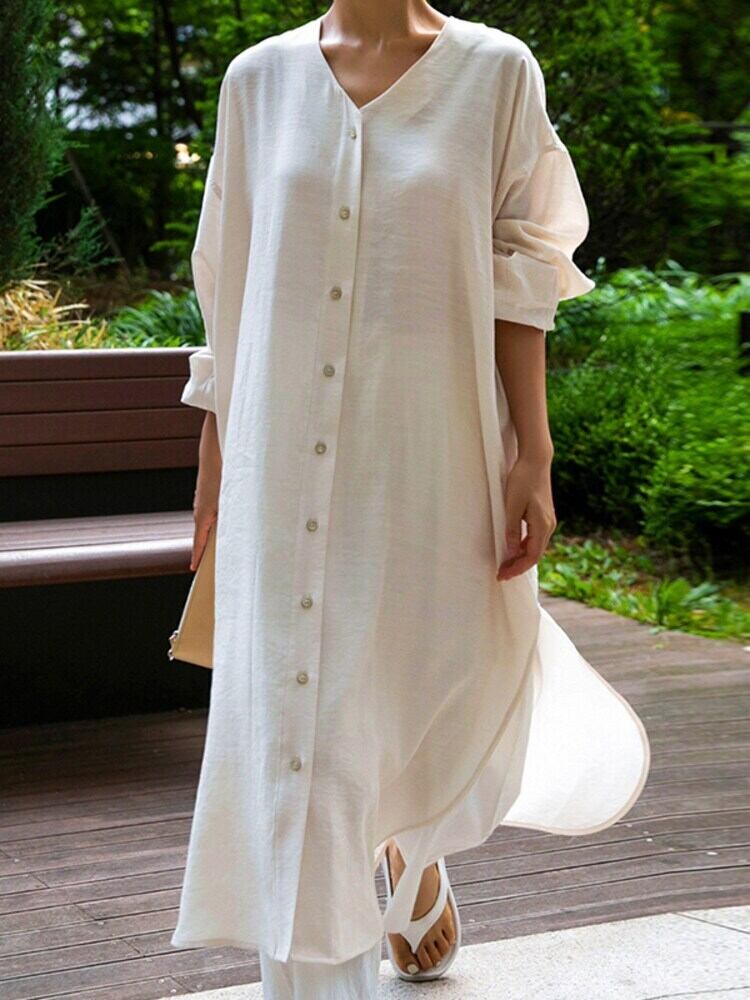 [EWQ] ルーズリネンシャツドレスシングルブレスト長袖ソリッドカラードレス秋潮 Vestido ロング オータム 秋物
