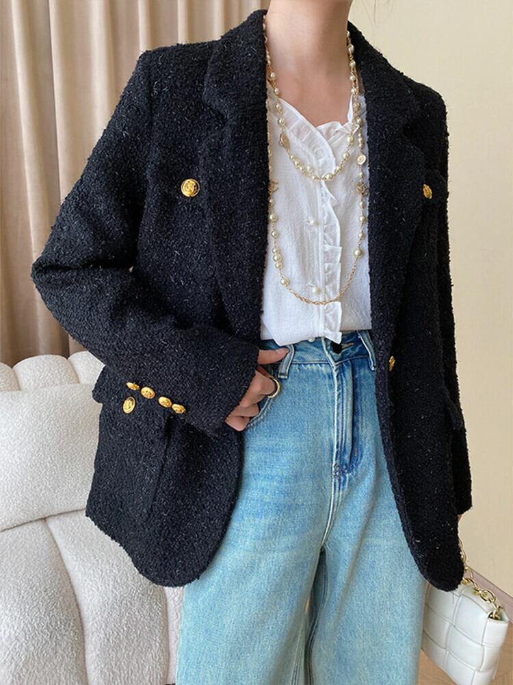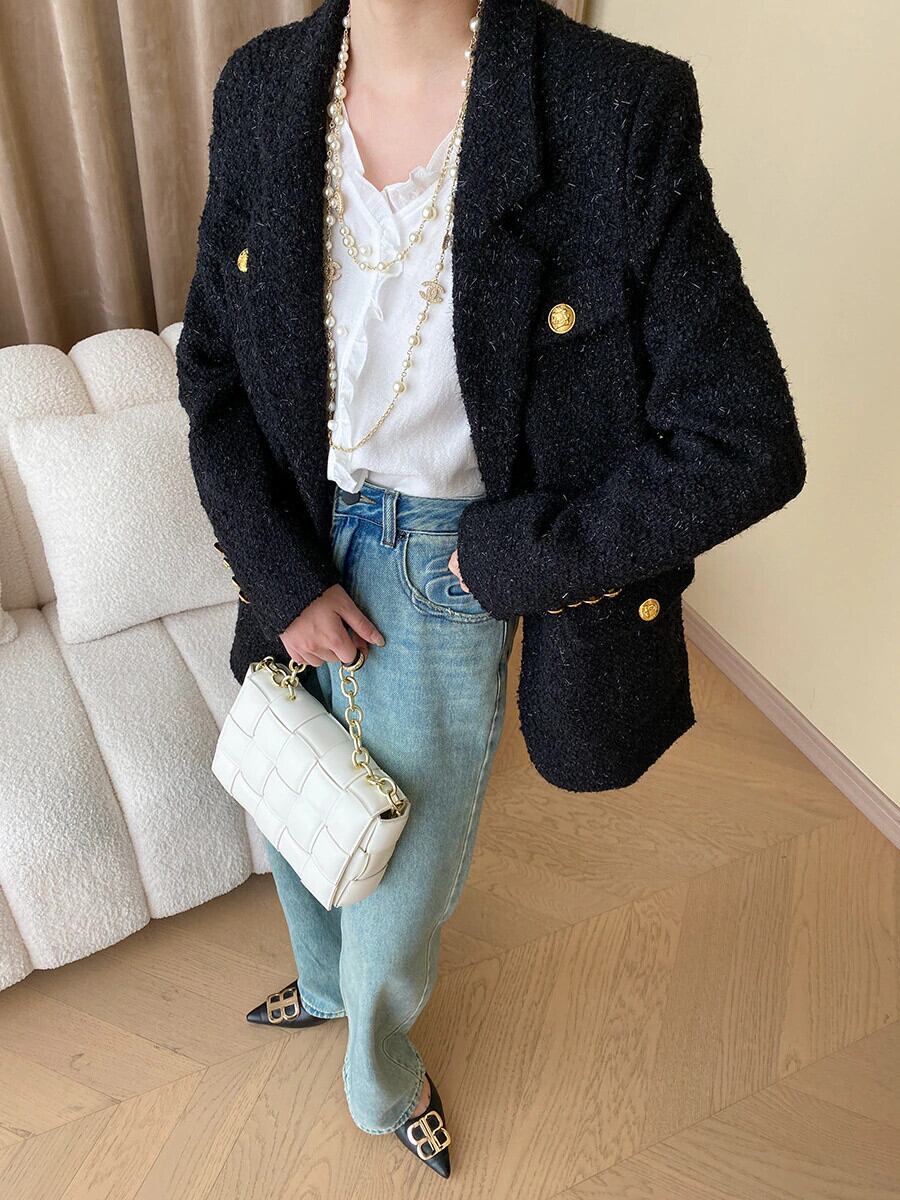 [EWQ] ツイードジャケット レディース 長袖 ボタン飾り丈ジャケット 秋潮 シングルブレストコート ロング オータム 秋物