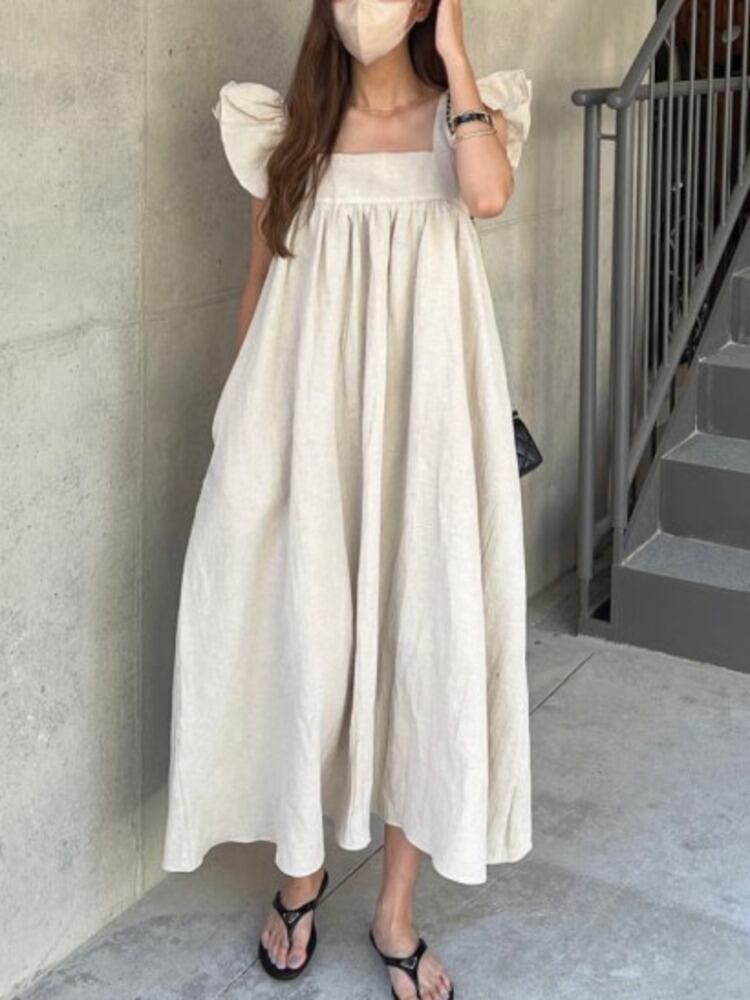 [EWQ] フリルスプライシングフライスリーブドレスプリーツパッチワークルーズポケットドレス夏潮 Vestido 16U3230 サマー 夏物
