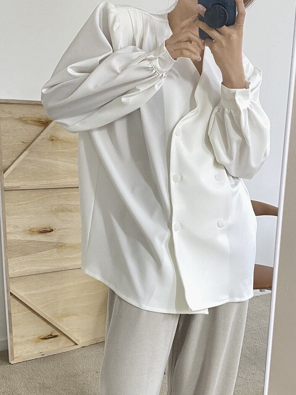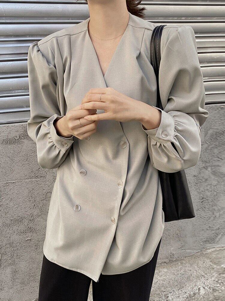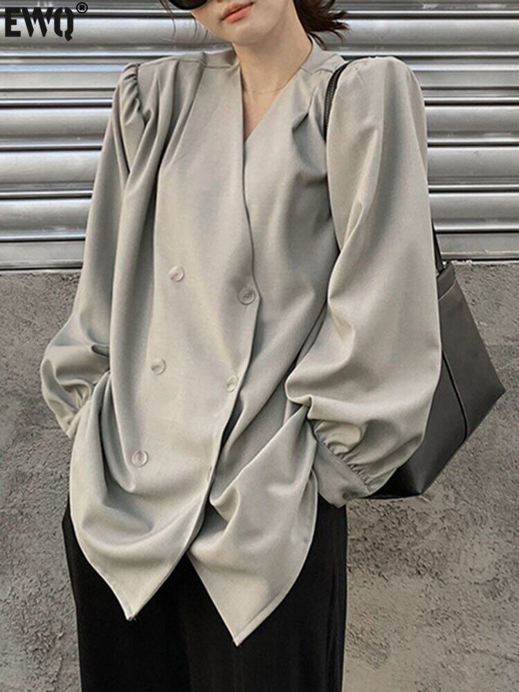 [EWQ] シック V ネックダブルブレストルーズシャツ秋長袖薄手ブラウストップス 16O434 ロング オータム 秋物 Vネック