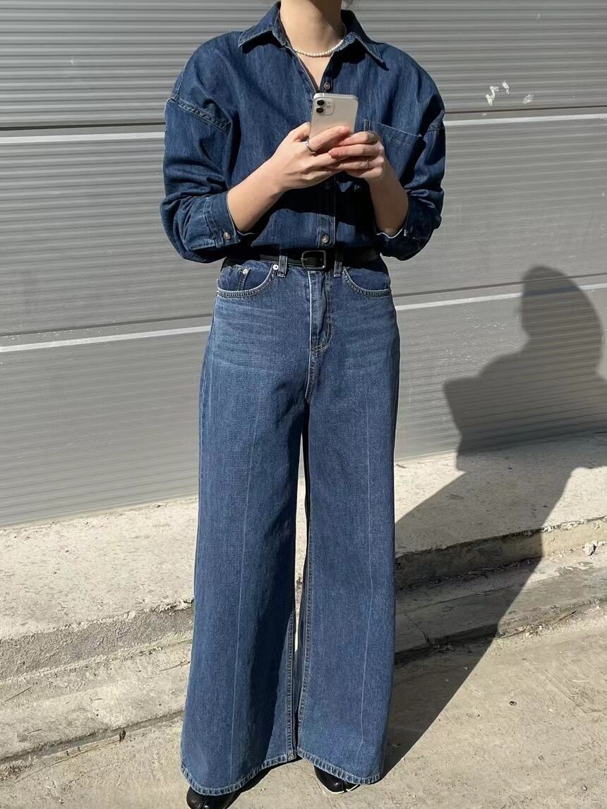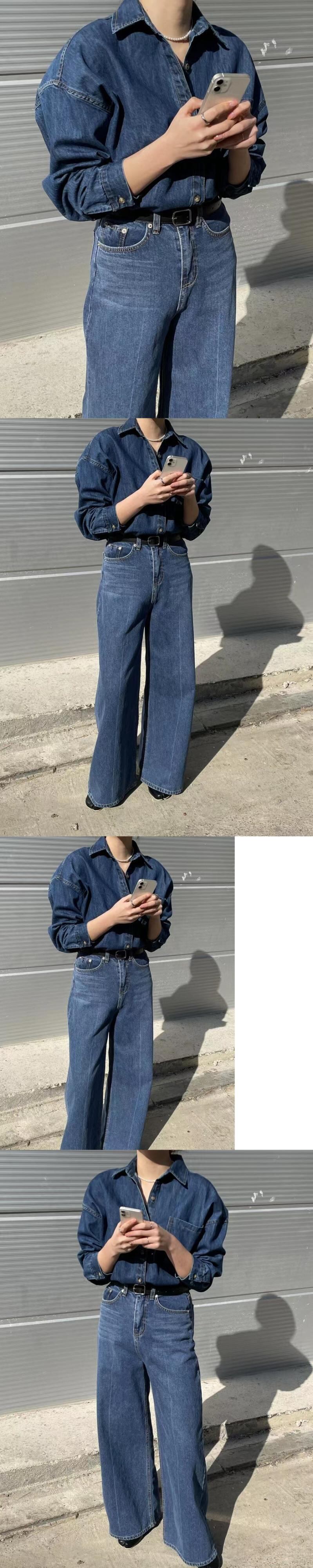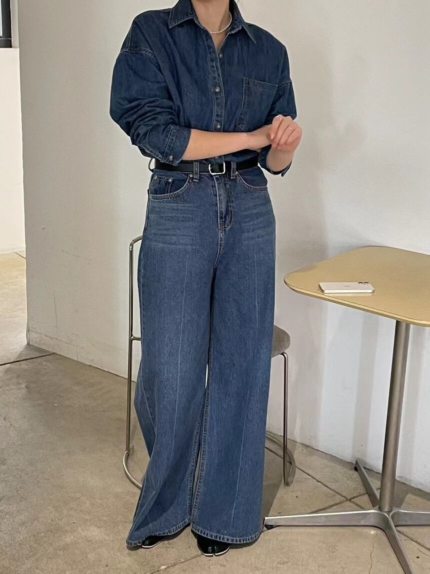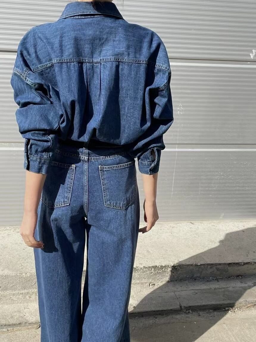 [EWQ] レディース デニム 2 点セット シングルブレスト ジャケット + ウエストポケット ワイドレッグ ジーンズ 秋潮 16U3301 オータム 秋物 ワイドパンツ