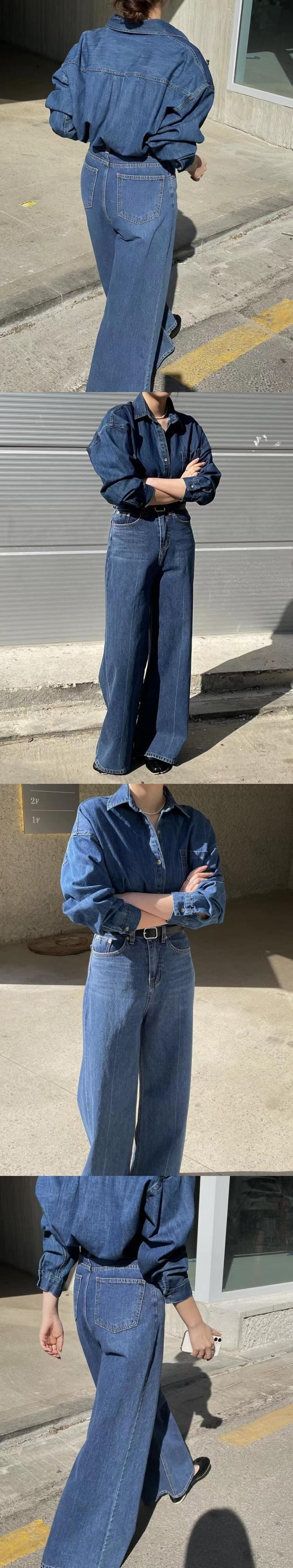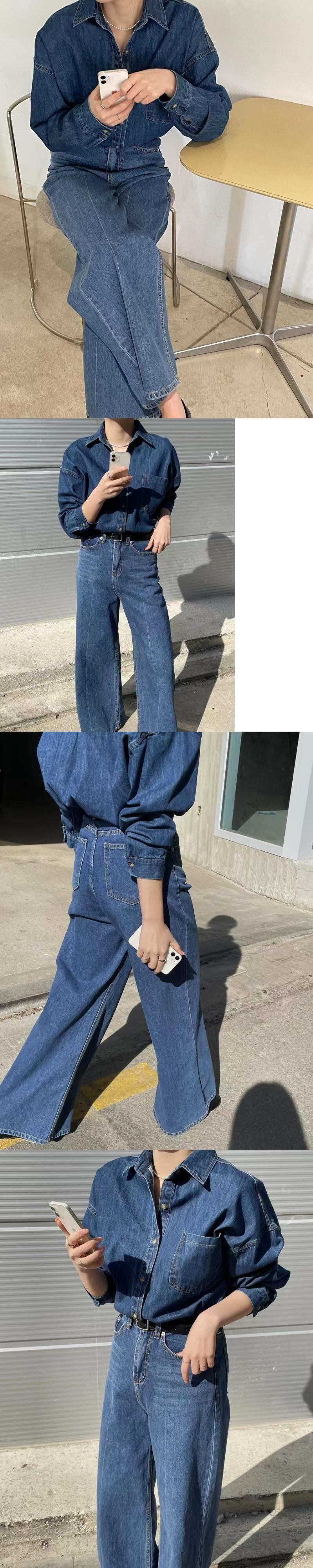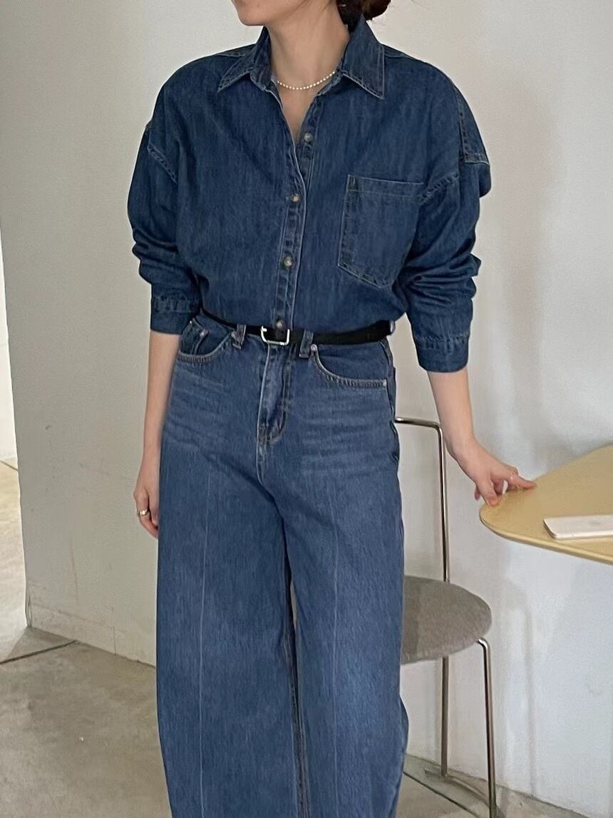 [EWQ] レディース デニム 2 点セット シングルブレスト ジャケット + ウエストポケット ワイドレッグ ジーンズ 秋潮 16U3301 オータム 秋物 ワイドパンツ