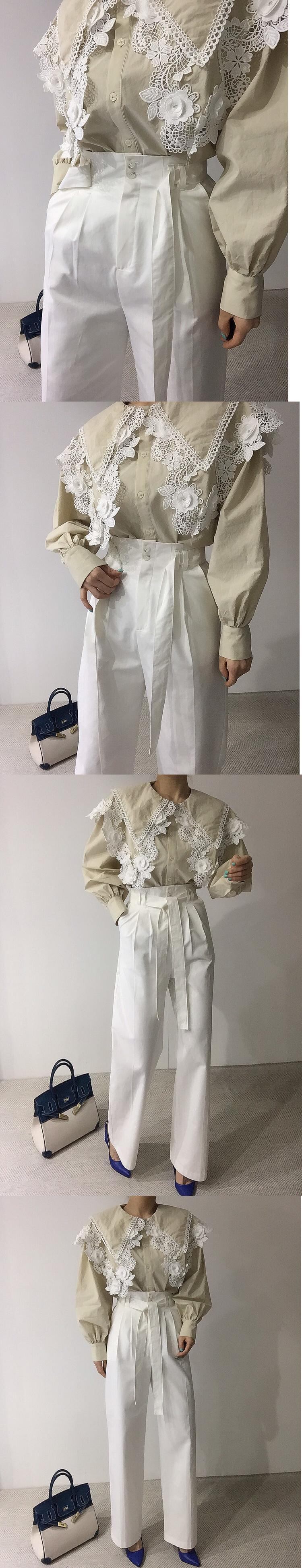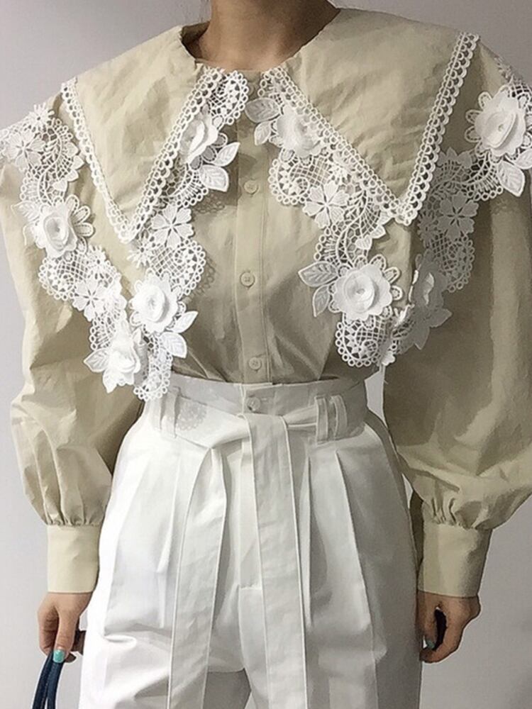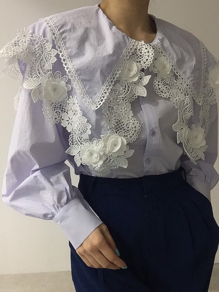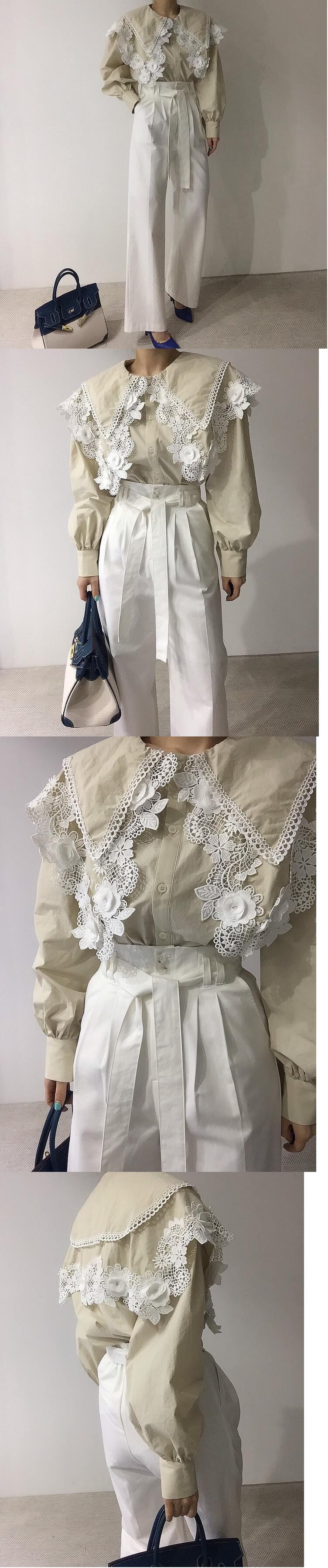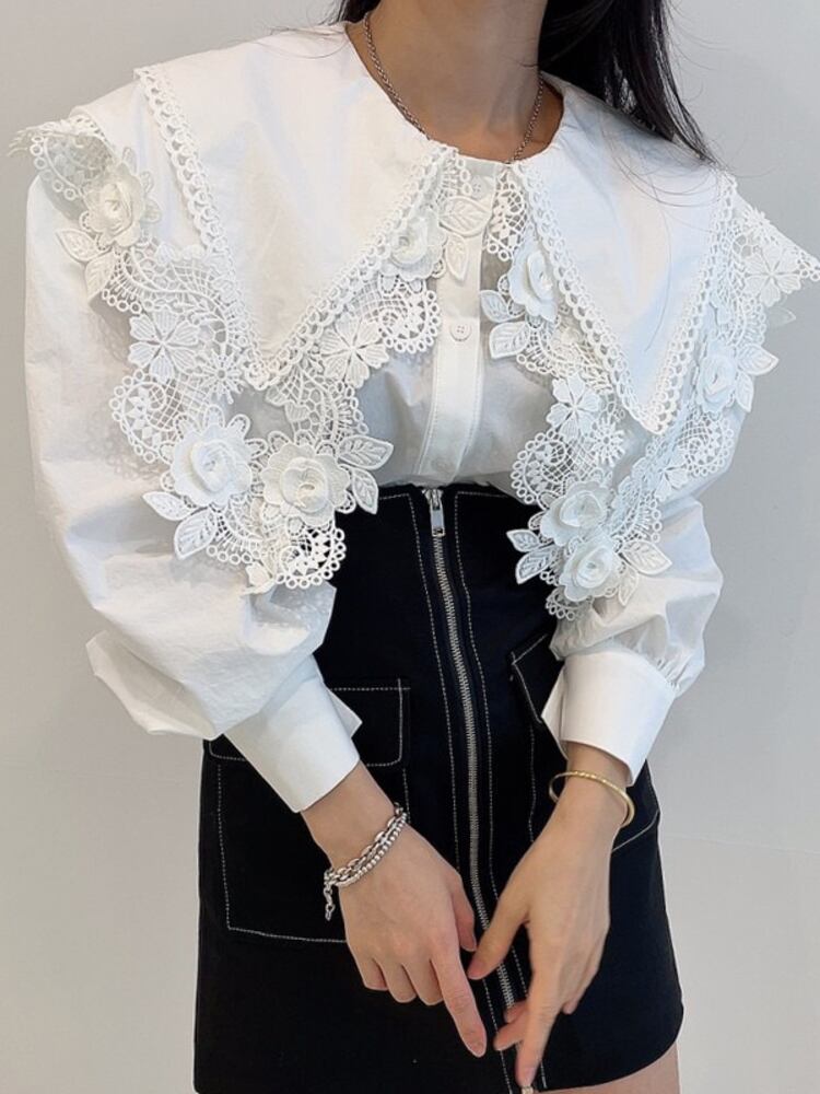 [EWQ] ダブルピーターパンカラーシャツランタンスリーブルーズフックフラワー秋潮トップス オータム 秋物 フラワーデザイン