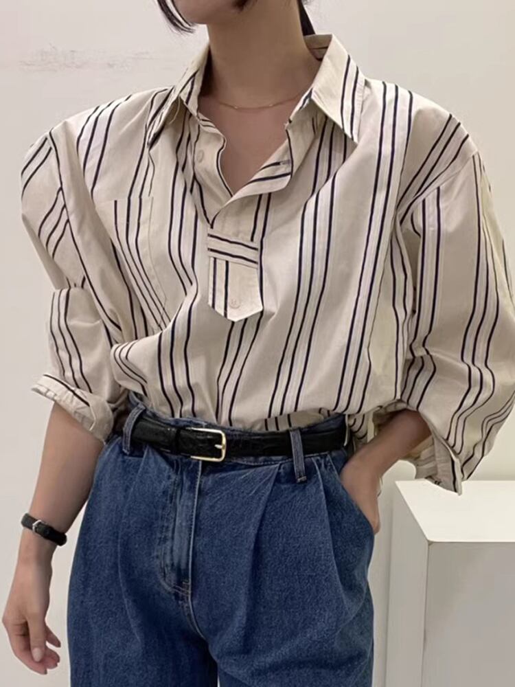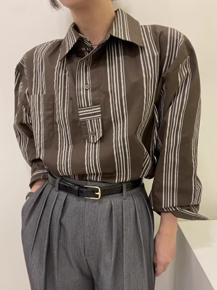 [EWQ] 長袖ストライプコントラストシャツシングルブレストルーズトップ秋冬トップ 16U4181 ロング オータム 秋物 ウィンター 冬物