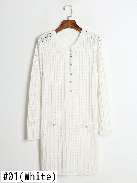 [EWQ] 中空アウト薄型ニットドレス秋潮長袖ボタン装飾セータードレス Vestido ロング オータム 秋物