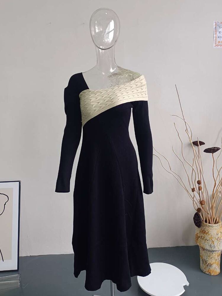 [EWQ] 甘い長袖 V ネックスリムドレス春秋シック不規則ニットステッチ A ラインドレス ロング 大人ガーリー スウィート キュート カジュアル スプリング 春物 オータム 秋物 Vネック Aライン