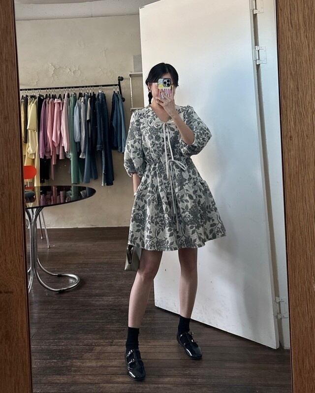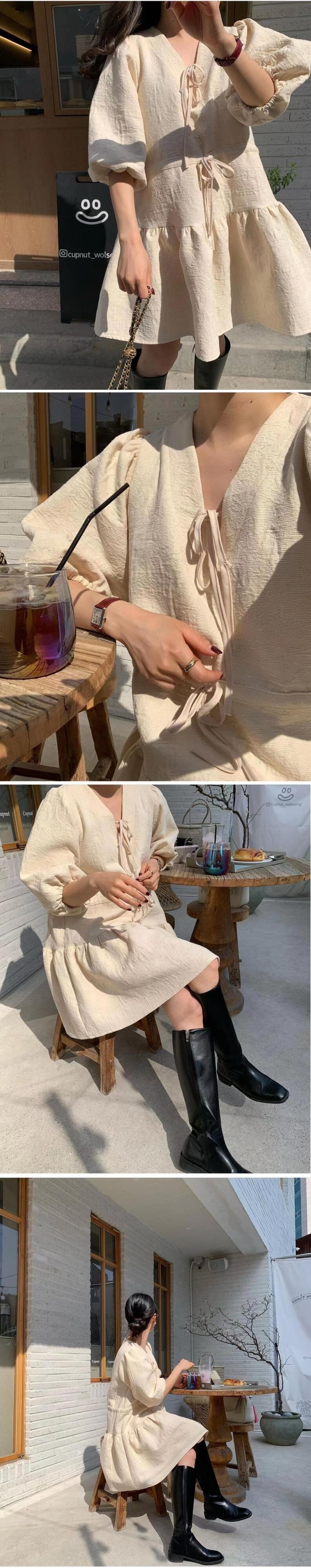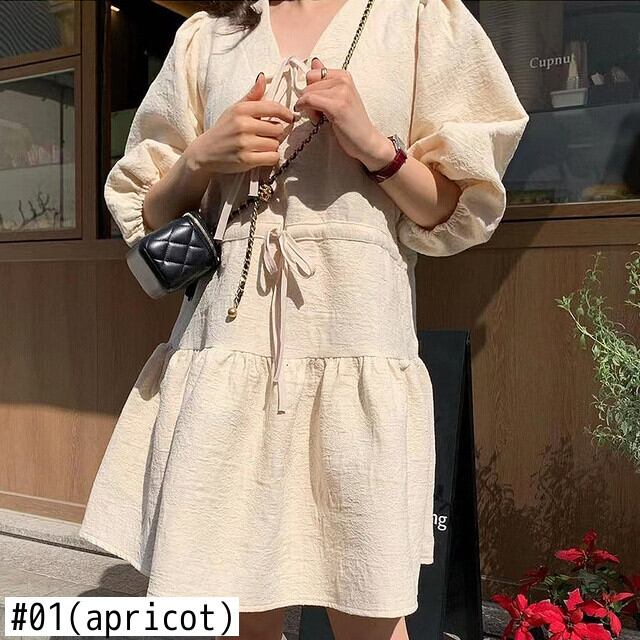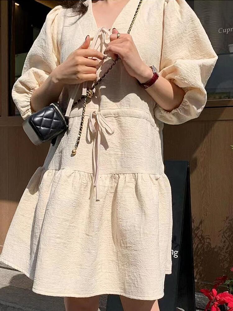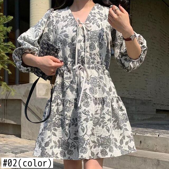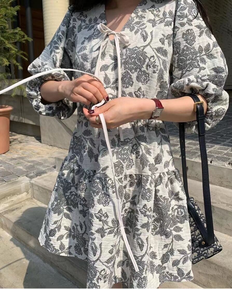[EWQ] V ネック巾着プリントミニドレス夏潮バブルスリーブコントラストドレス Vestido 6U2517 サマー 夏物 Vネック