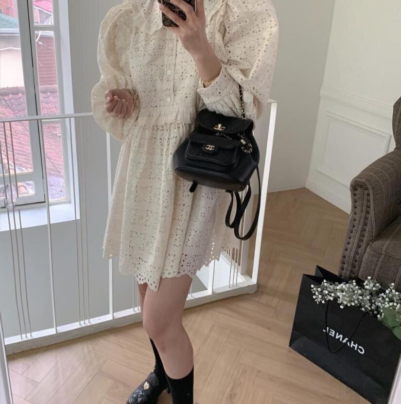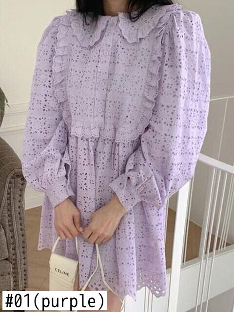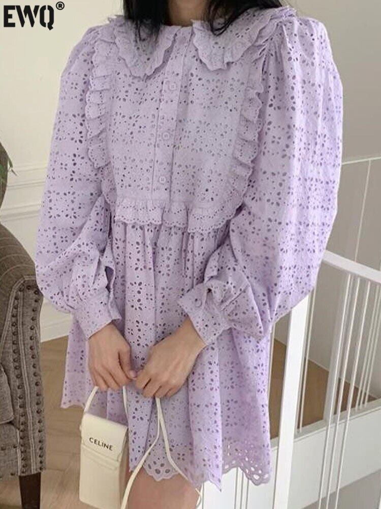 [EWQ] レースフックフラワーフリルルーズドレス秋ペーターパン襟ミニドレス Vestido 16O416 ラッフル オータム 秋物 フラワーデザイン