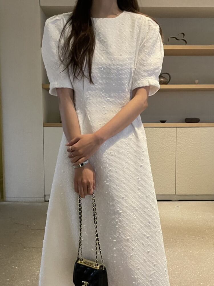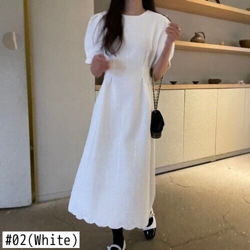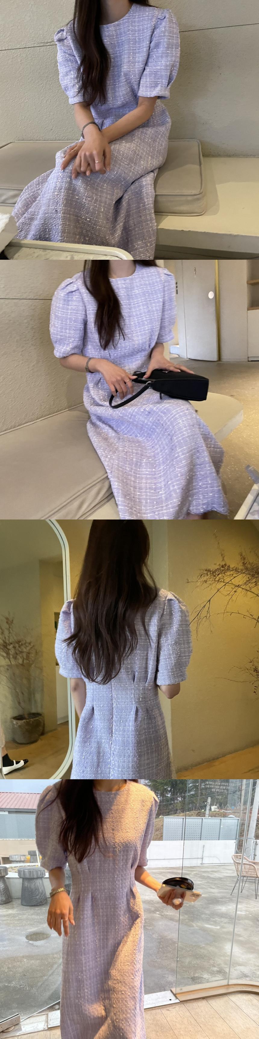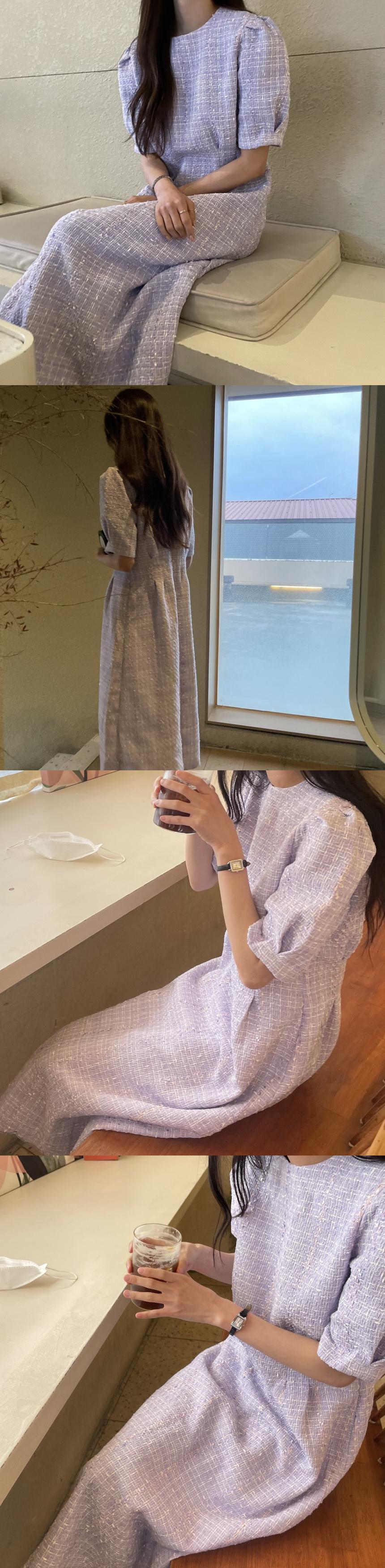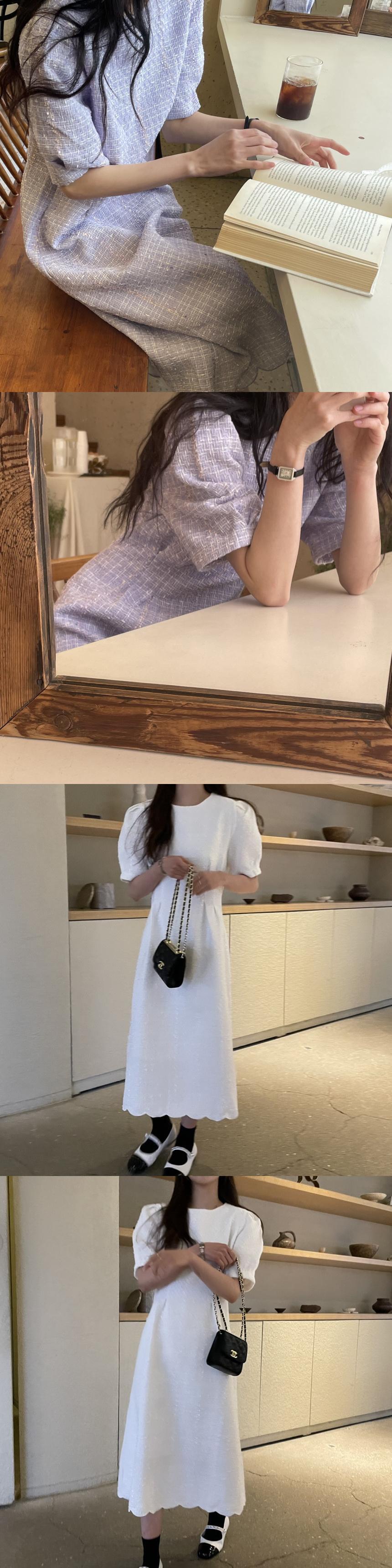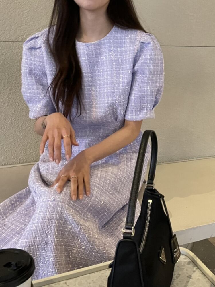 [EWQ] シック O ネック半袖紫ツイードドレス服ロング白チェック柄ドレス夏秋 16Y32 ショート ホワイト ハーフスリーブ サマー 夏物 オータム 秋物 Oネック パープル