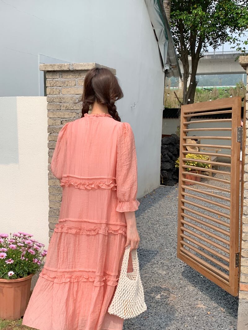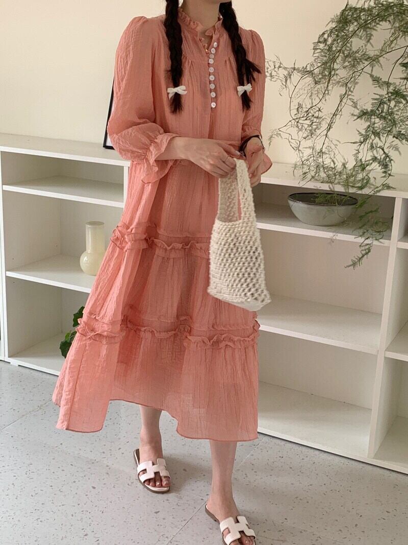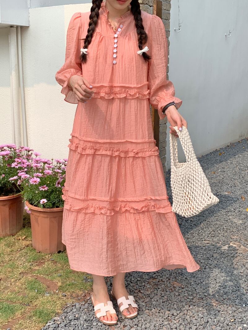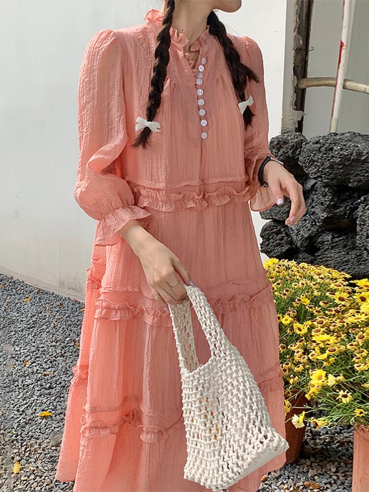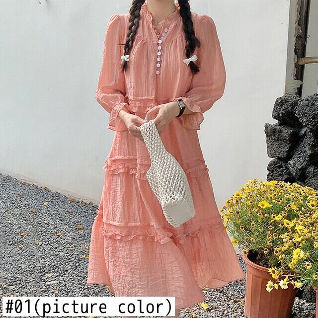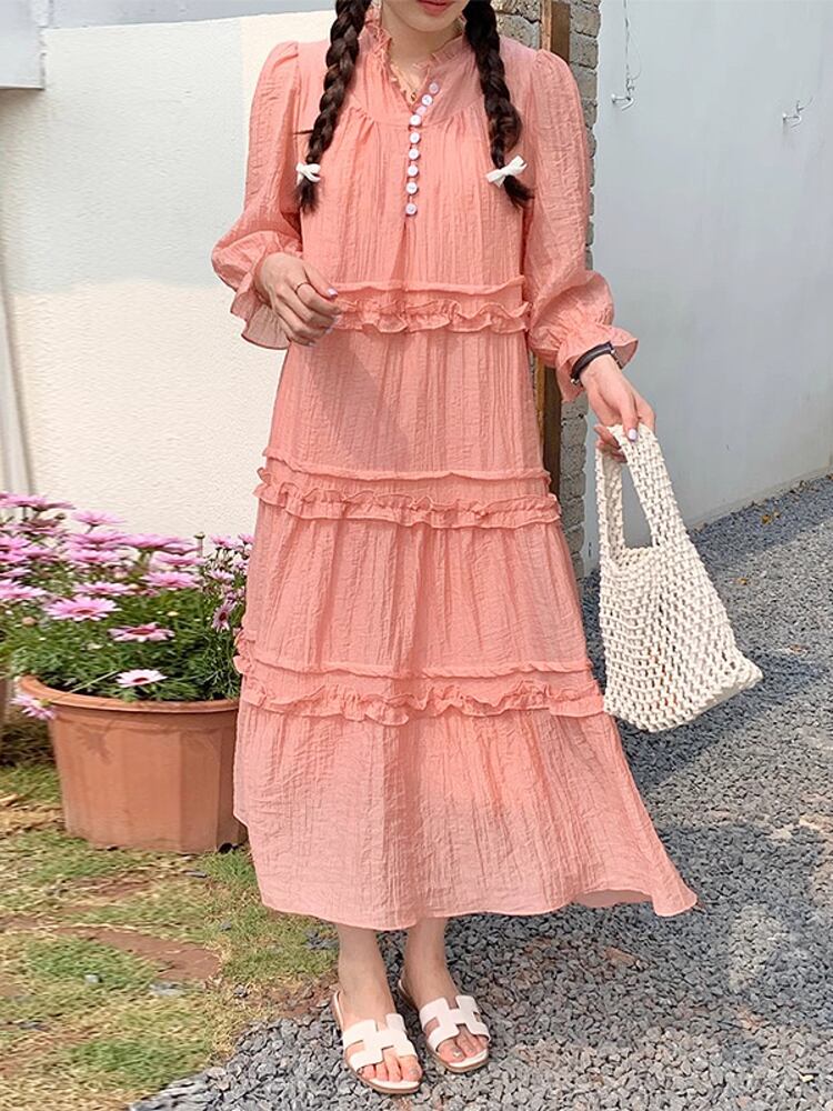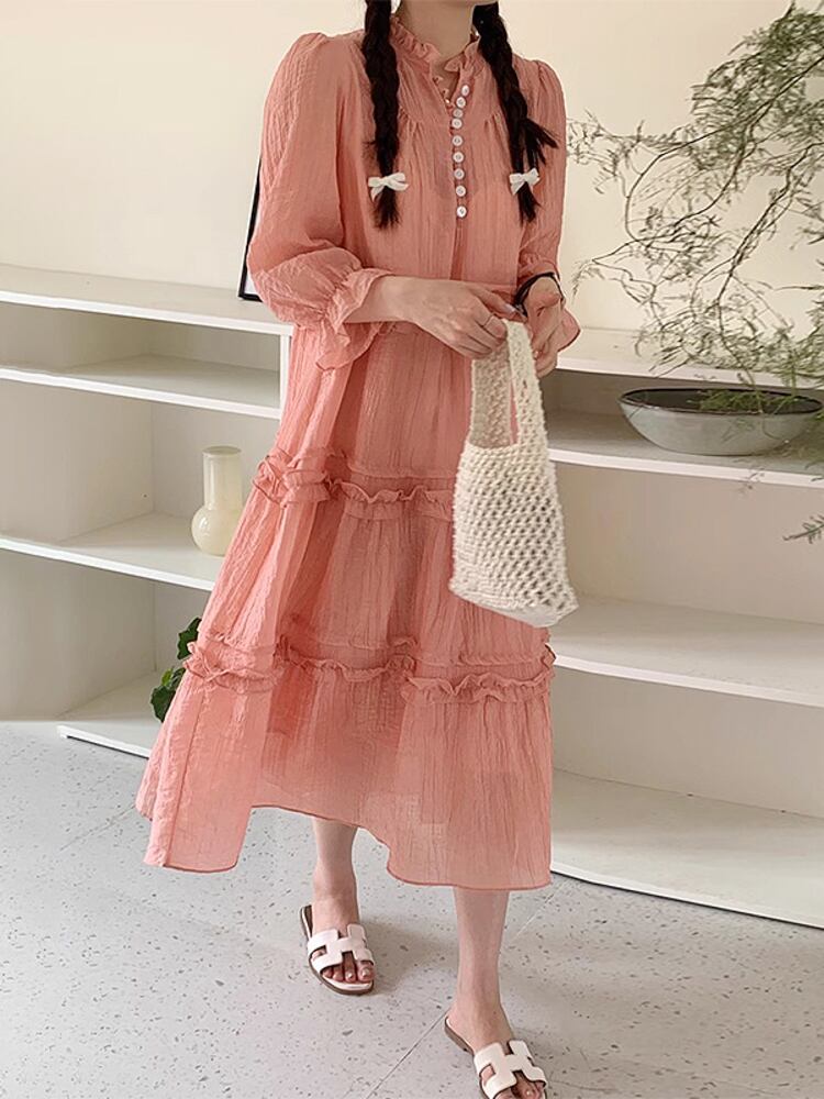 [EWQ] 甘いバブルスリーブドレス菌パッチワークルーズソリッドカラードレス夏潮ボタン装飾 Vestido 大人ガーリー スウィート キュート カジュアル サマー 夏物