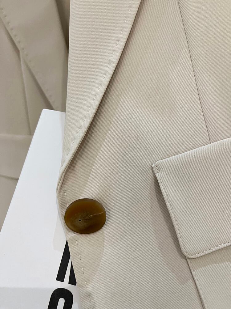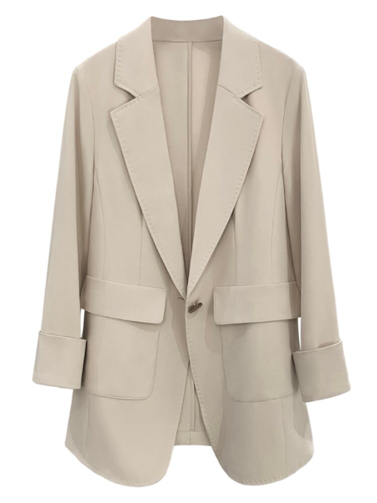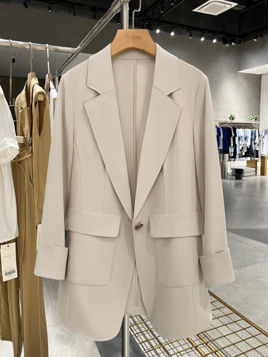 [EWQ] ポケットパッチワークベージュブレザーコート長袖 1 ボタンルーズスーツジャケット秋潮 ロング オータム 秋物