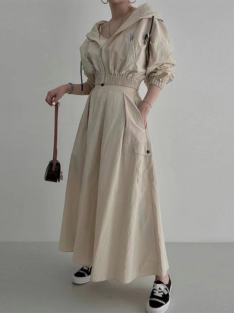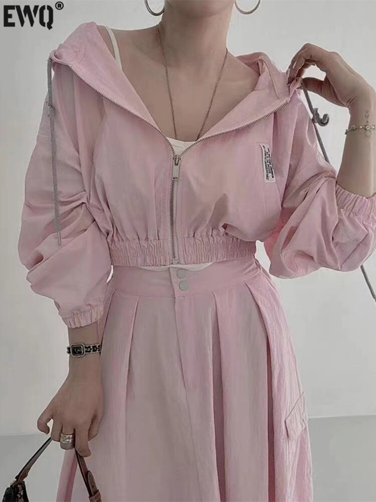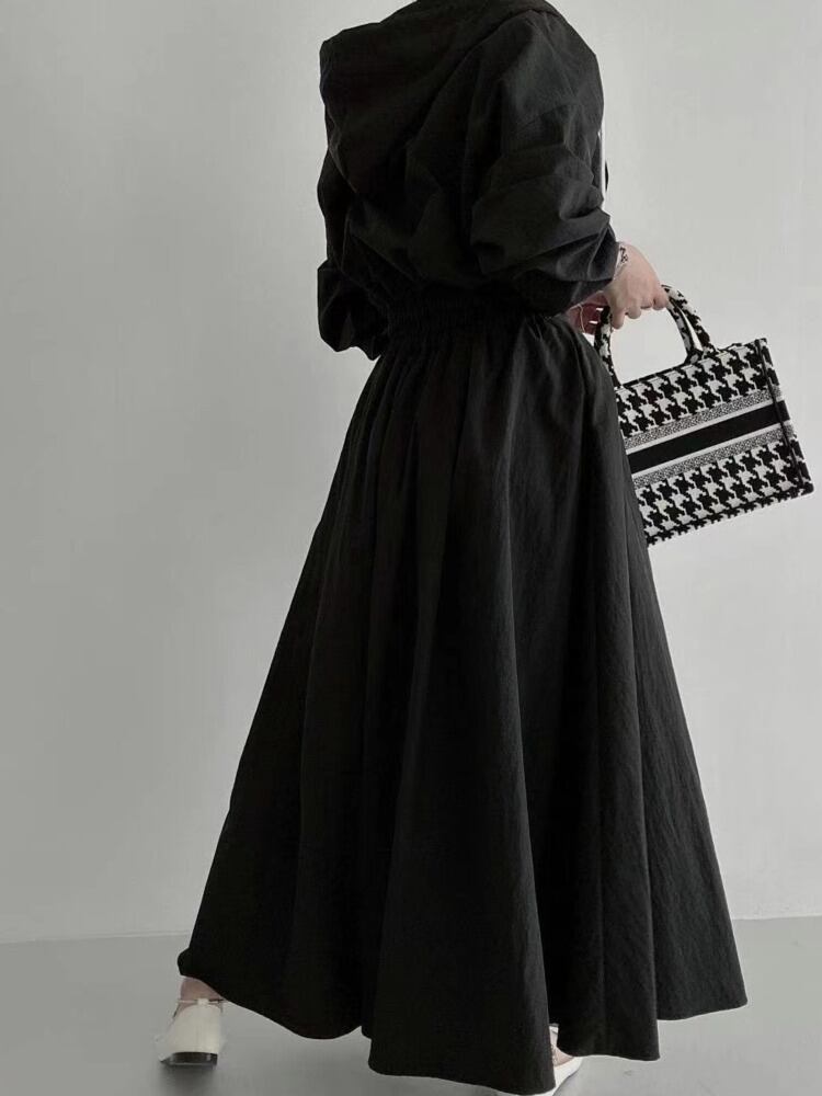 [EWQ] 甘い 2 点セット フード付きジッパー ジャケット + ウエスト弾性ミッドカーフ スカート 秋冬服 16U4343 エラスティック 伸縮 大人ガーリー スウィート キュート カジュアル オータム 秋物 ウィンター 冬物