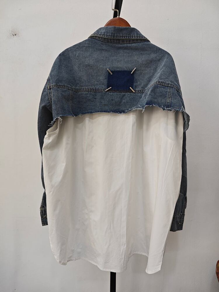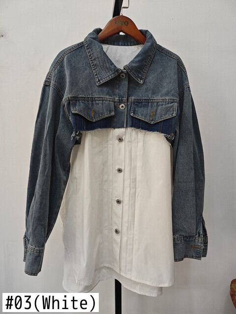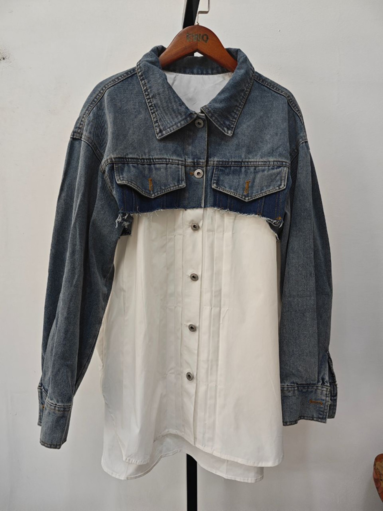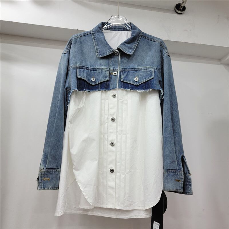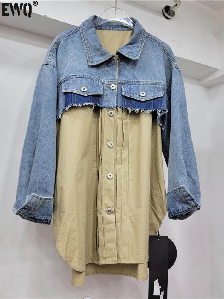 【EWQ】長袖パッチワークデニムコントラストカラーシャツジャケット秋レディース服大きいサイズアウターカーキトップスU385 ロング オータム 秋物