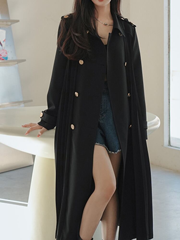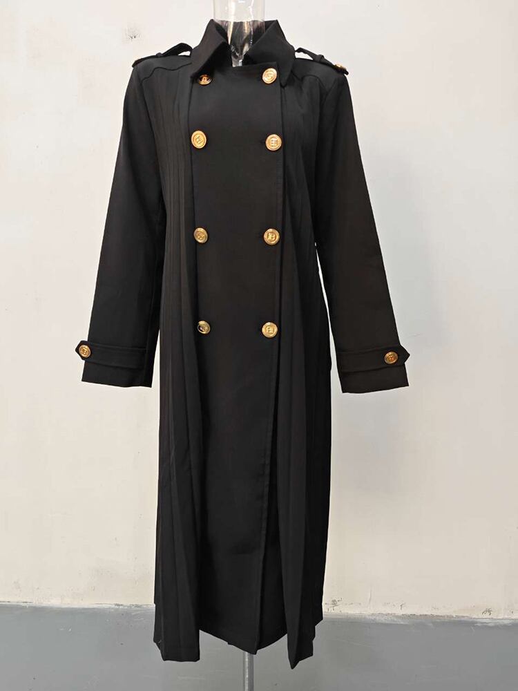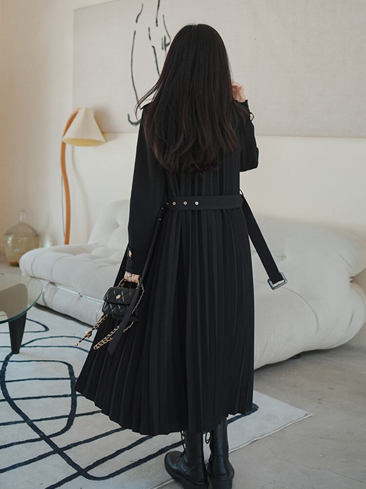 [EWQ] 黒プリーツウインドブレーカーコート長袖ダブルブレストベルト付きトレンチコート秋冬生き抜く ロング ブラック オータム 秋物 ウィンター 冬物 ハーネス