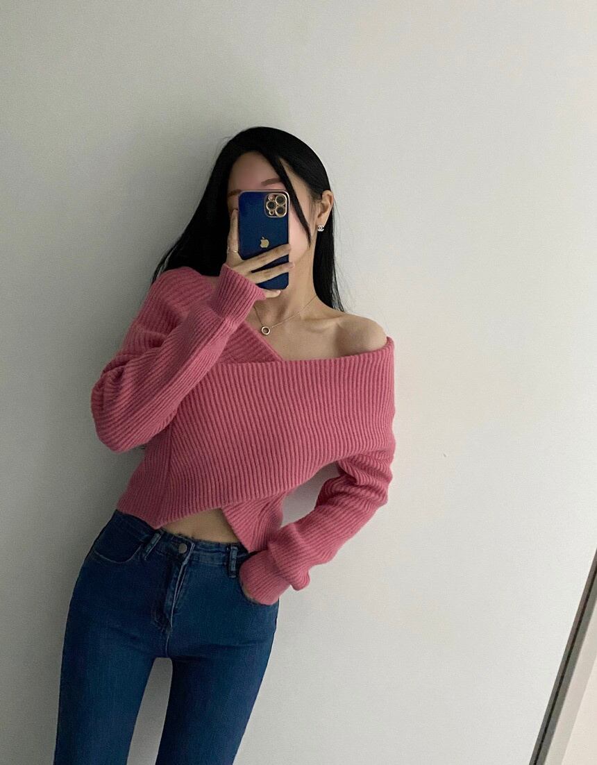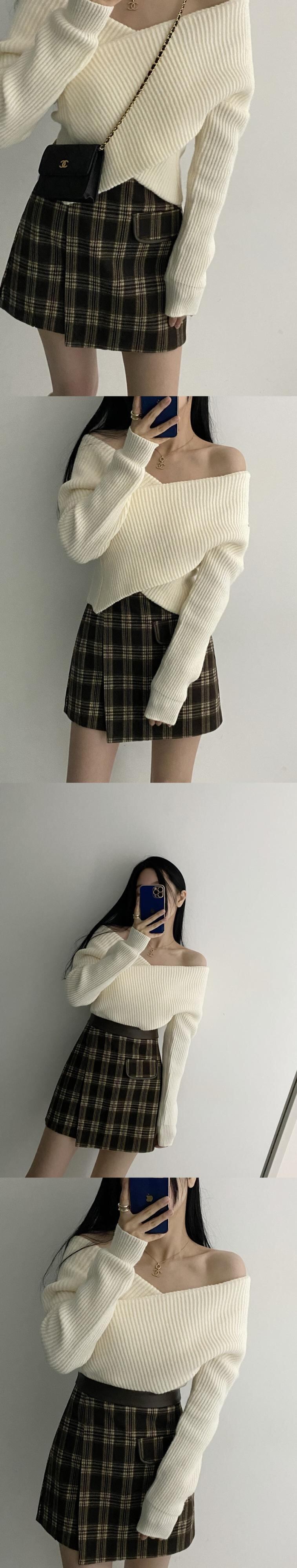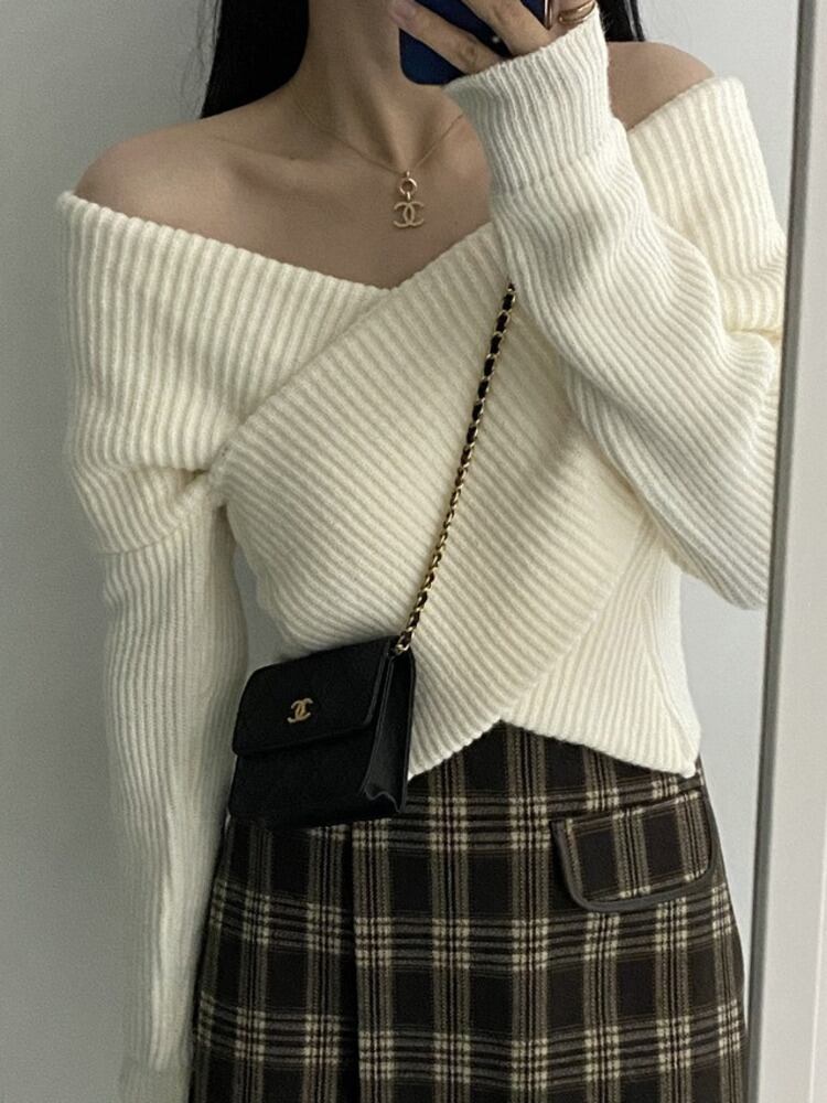 [EWQ] セクシークロスオフショルダーカラーセーター長袖ルーズプルオーバーニット秋潮ニットトップ 16U2520 ロング オータム 秋物