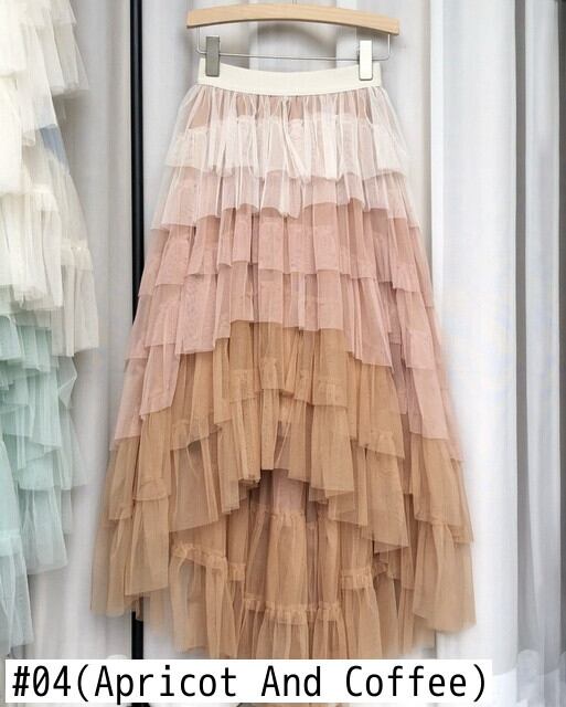 [EWQ] グラデーションコントラストカラーフリルパッチワークメッシュスカートレディースイレギュラースカート夏潮16O385 ラッフル サマー 夏物