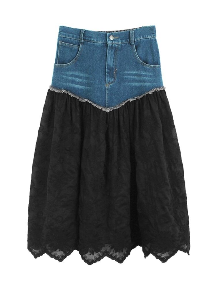 [EWQ] バリ不規則デニムパッチワークスカート遠近フックフラワーレーススプライスウエストスカート秋潮 12 オータム 秋物 フラワーデザイン