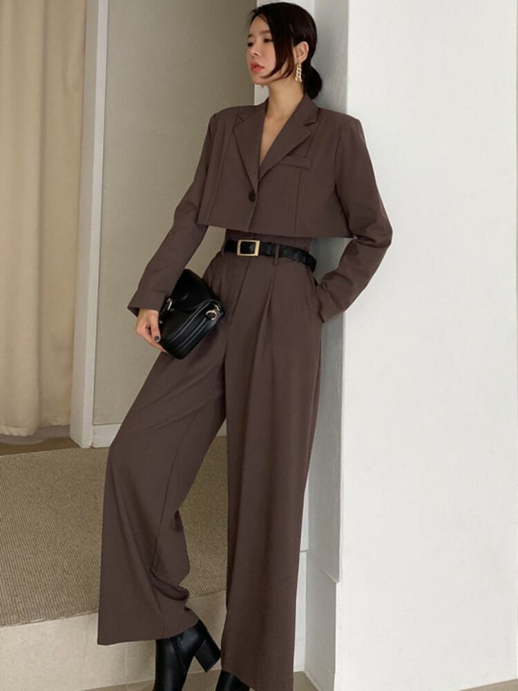 [EWQ] レディース ワンボタン ブレザー+ウエスト ワイドレッグ スーツ パンツ オフィスレディ 2点セット 秋冬 16U4340 オータム 秋物 ウィンター 冬物 ワイドパンツ 会社 学校 通勤や通学にも