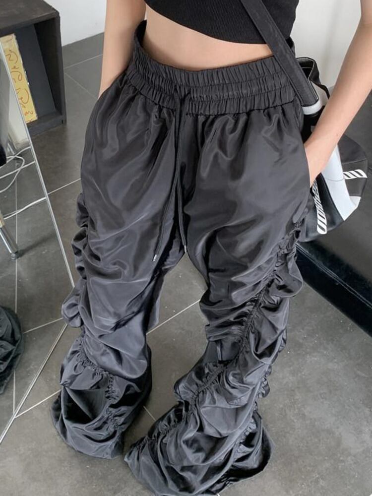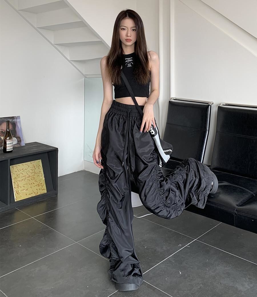 [EWQ] ストリート弾性ウエスト巾着黒パンツシャーリングルーズズボン秋 16O313 ブラック エラスティック 伸縮 オータム 秋物
