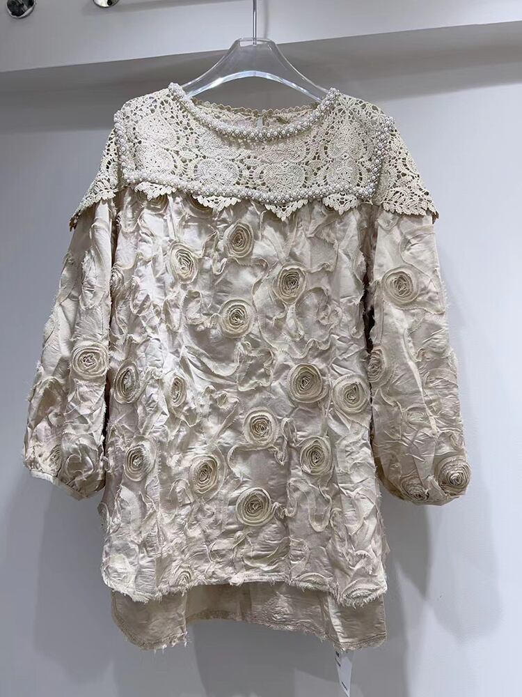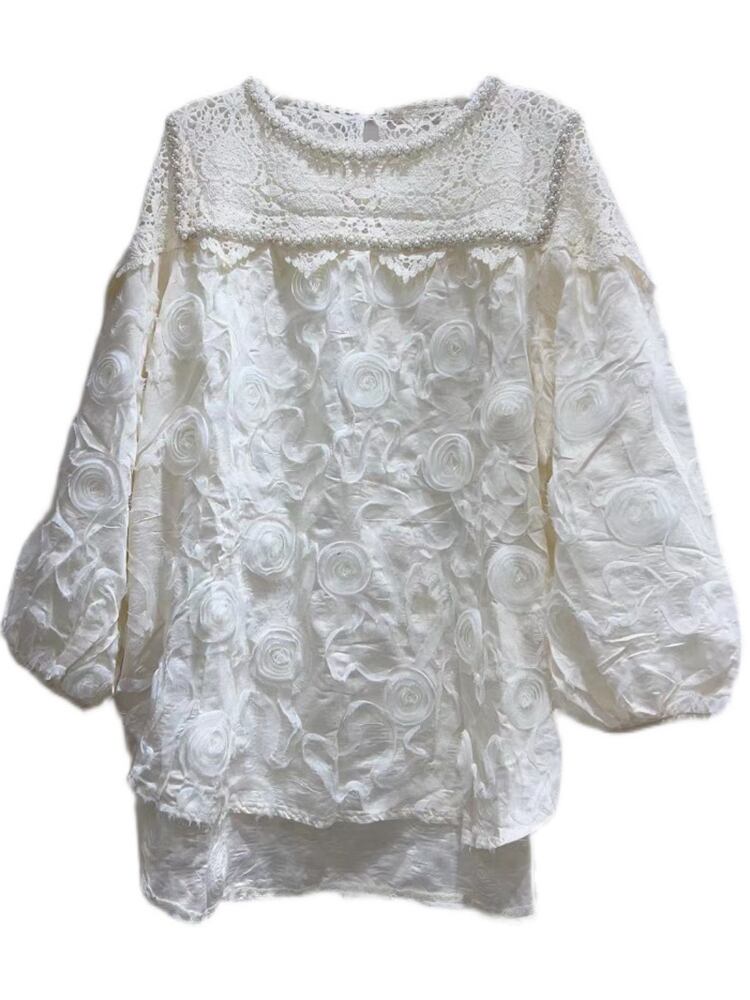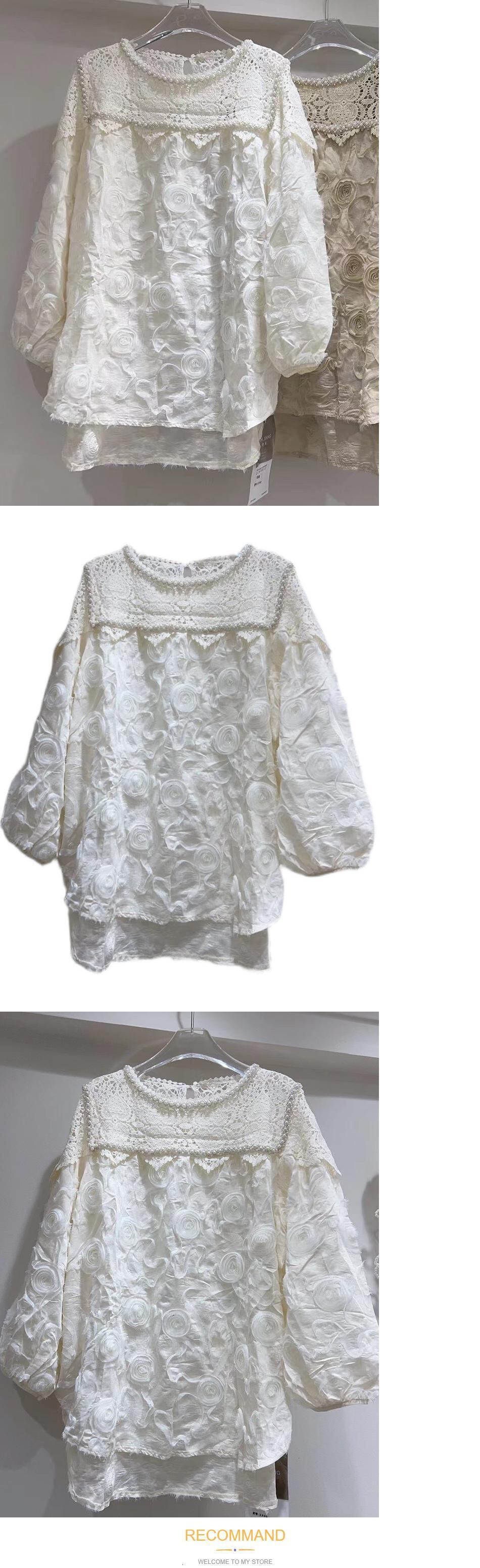[EWQ] レースフックフラワーパッチ白シャツピーターパンカラールーズ秋冬潮ブラウス 16U3707 ホワイト オータム 秋物 ウィンター 冬物 フラワーデザイン
