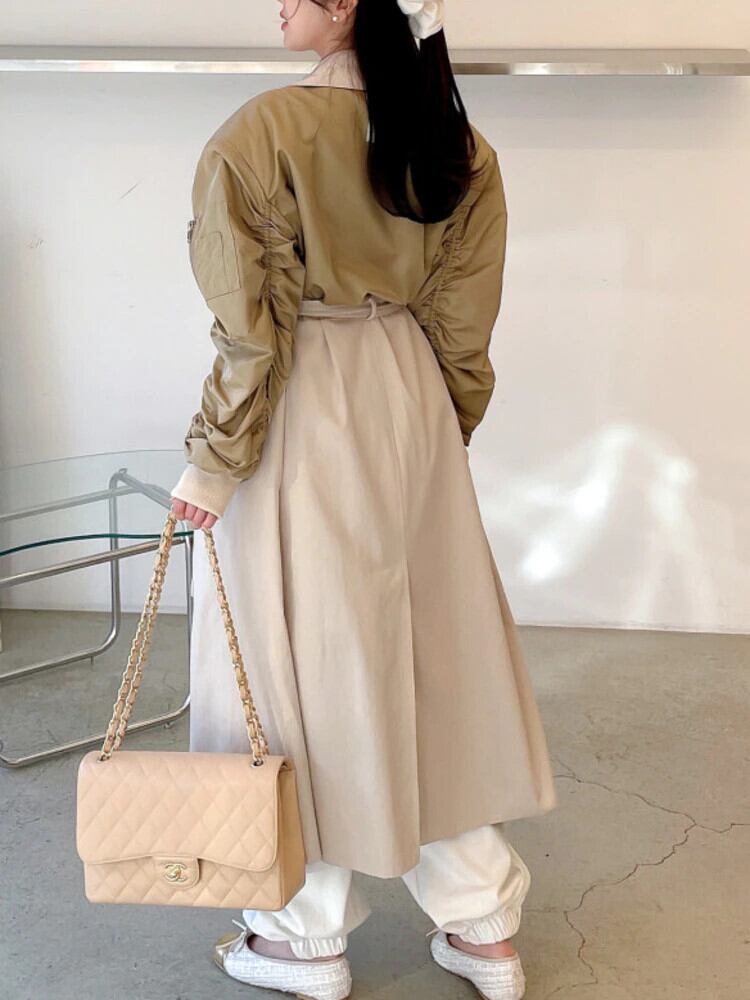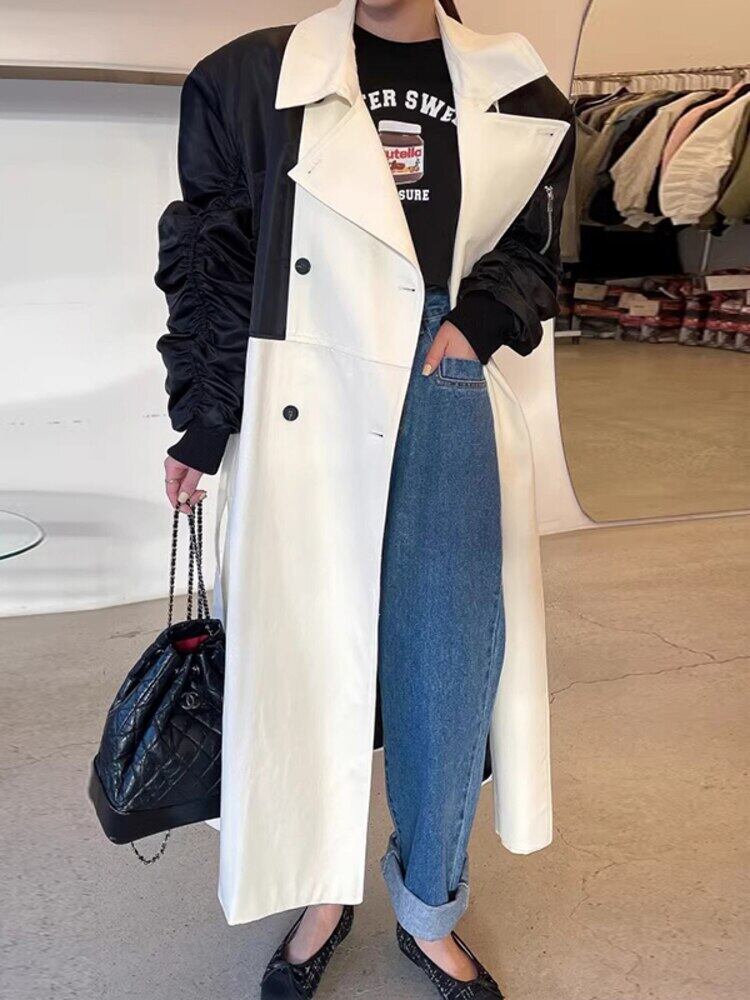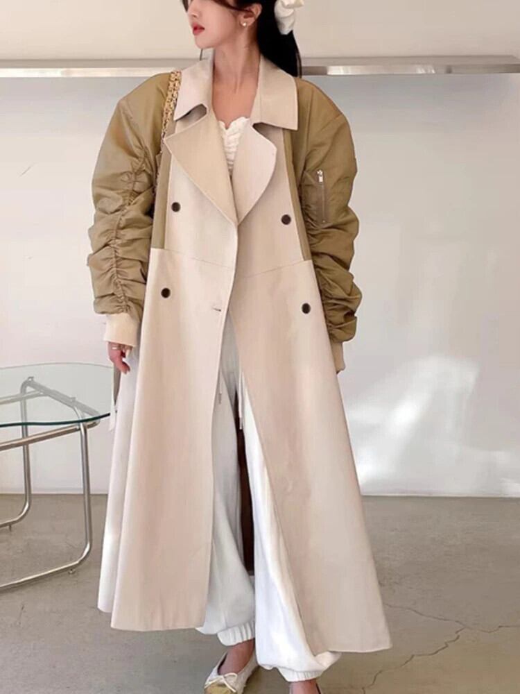 [EWQ] ベルト付き長袖ウインドブレーカーパッチワークコントラストダブルブレストトレンチジャケット秋冬 16U4225 ロング オータム 秋物 ウィンター 冬物 ハーネス