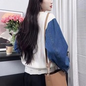 [EWQ] デニムパッチワーク長袖セーター O ネックルーズコントラストプルオーバーニット秋冬潮トップ ロング オータム 秋物 ウィンター 冬物 Oネック