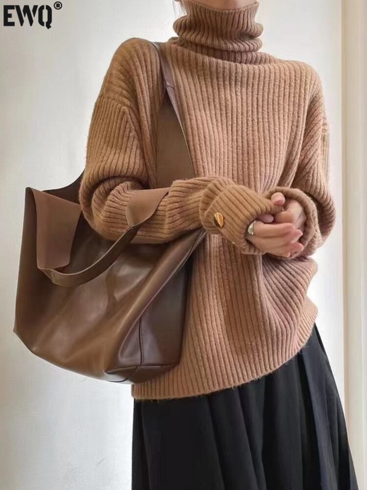 [EWQ] 長袖レディースタートルネックコーヒーセーター秋ニット暖かい美しいトップスオーバーサイズニットベーシックプルオーバー ロング オータム 秋物