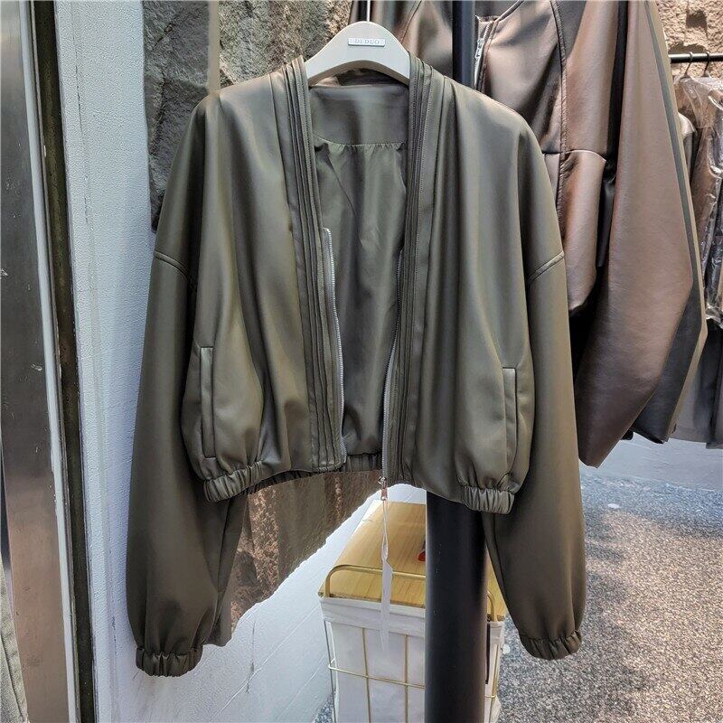 [EWQ] ブラックレザージャケット長袖 V ネックストリートジップアップ PU ジャケットコート秋冬潮 16U4050 ロング オータム 秋物 ウィンター 冬物 Vネック