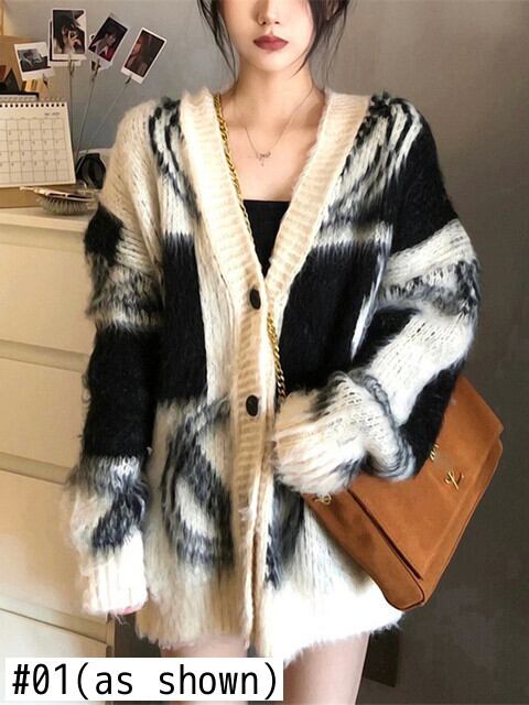 [EWQ] ブラックホワイトコントラストカーディガンコート長袖シングルブレストルーズセータージャケット秋潮 ロング オータム 秋物