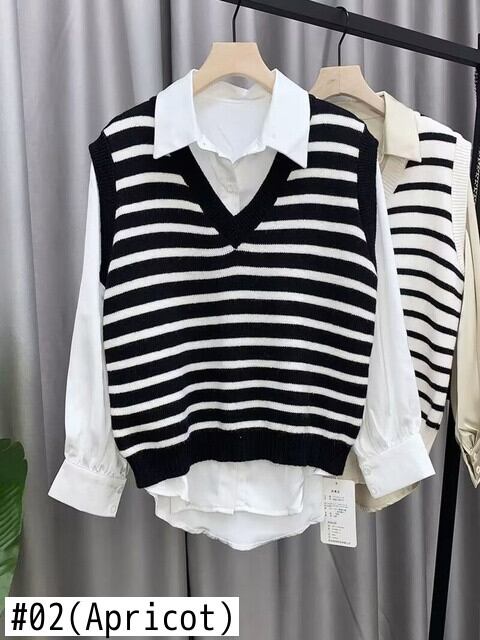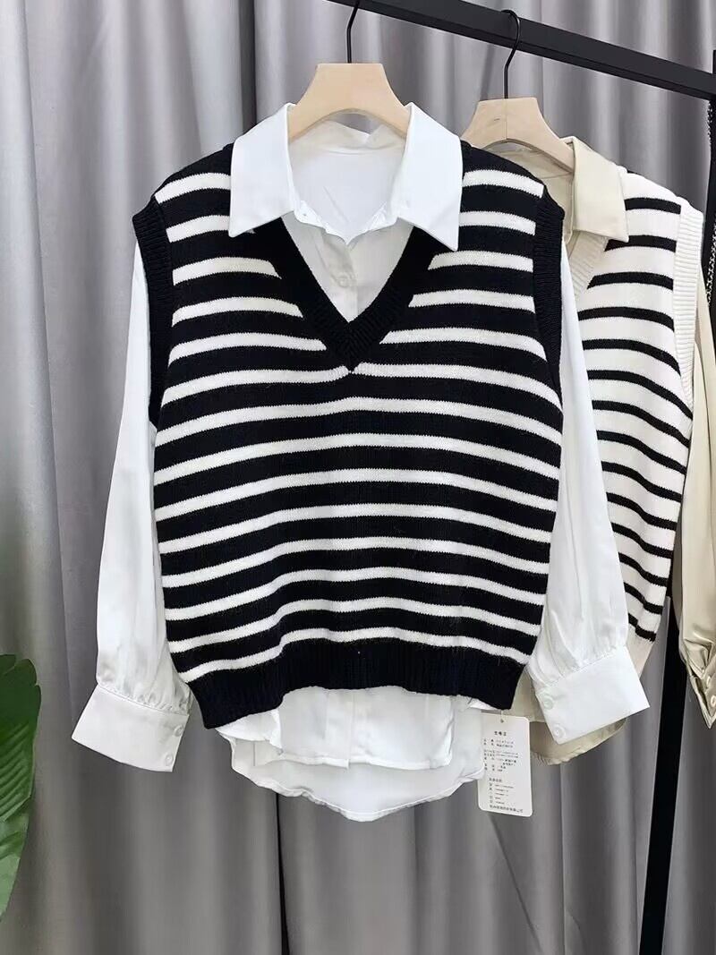[EWQ] ストライプニットベスト + 長袖白シャツ 2 点セット秋潮ルーズ服 6U3181 ロング ホワイト オータム 秋物