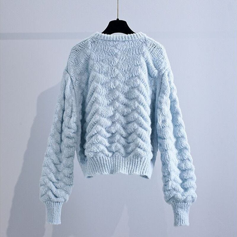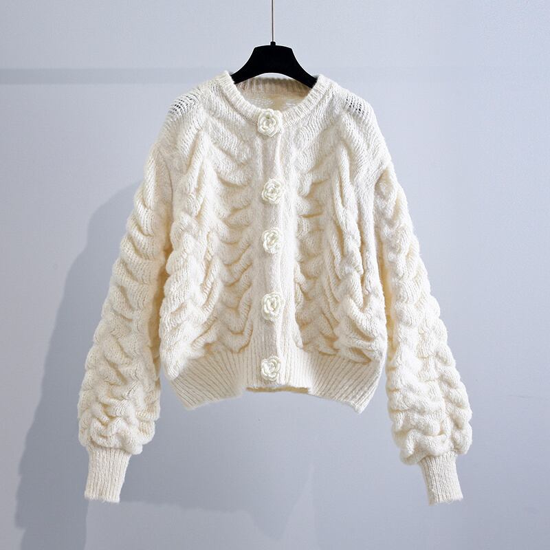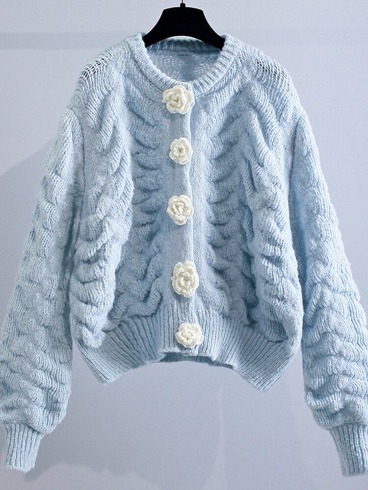 [EWQ] 花ボタン装飾カーディガンコート長袖ブルーセータージャケット冬秋潮ニットコート ロング オータム 秋物 ウィンター 冬物 フラワーデザイン