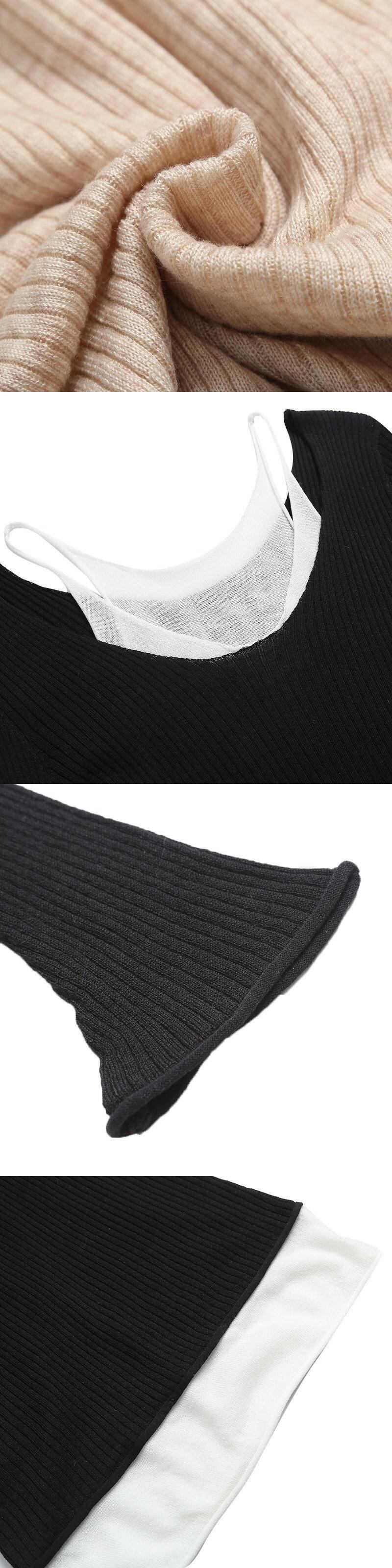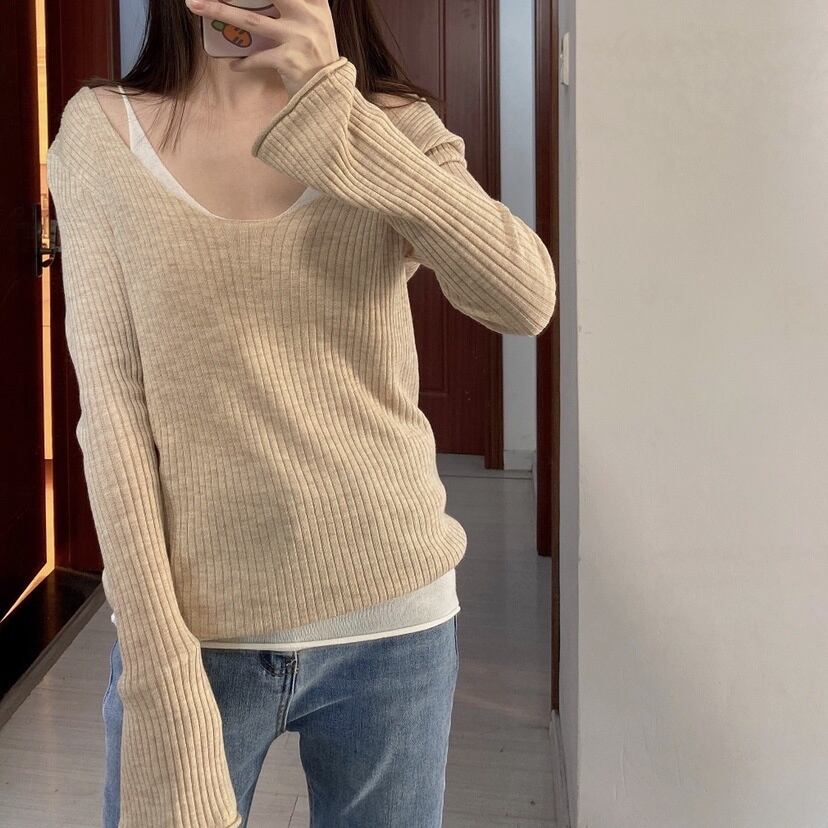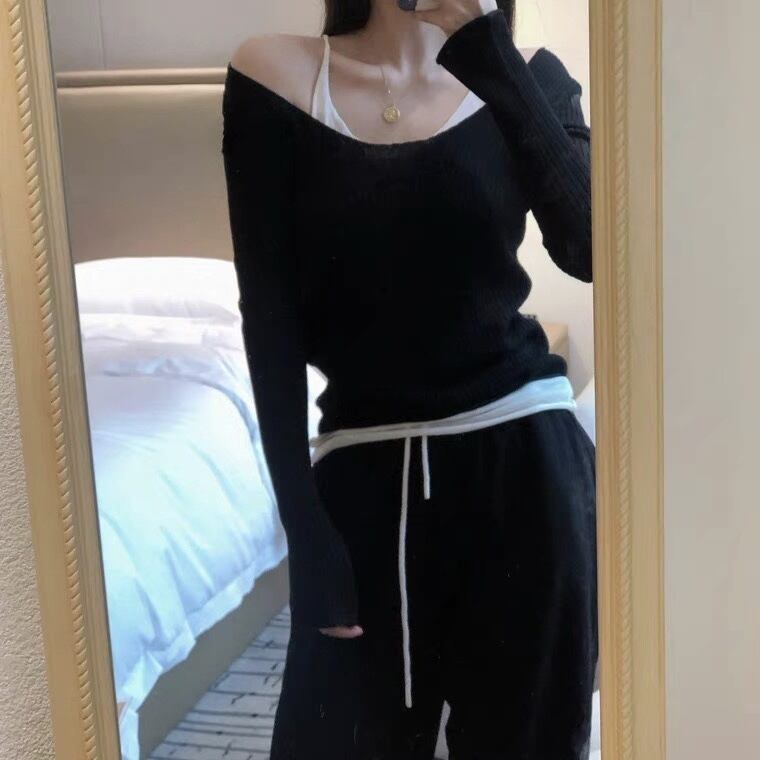 [EWQ] セクシーセーターベスト偽ツーピーススリムフィットオフショルダーストラップニットタンクトップ秋潮薄い服 オータム 秋物
