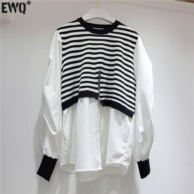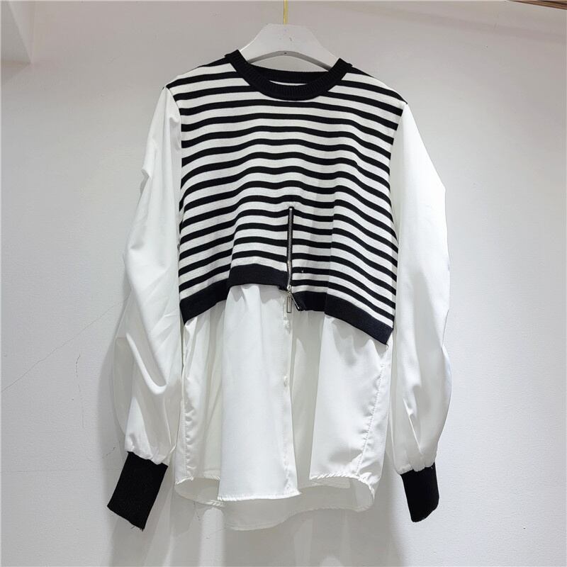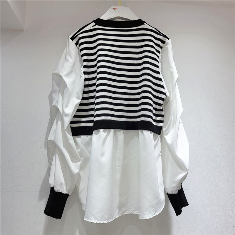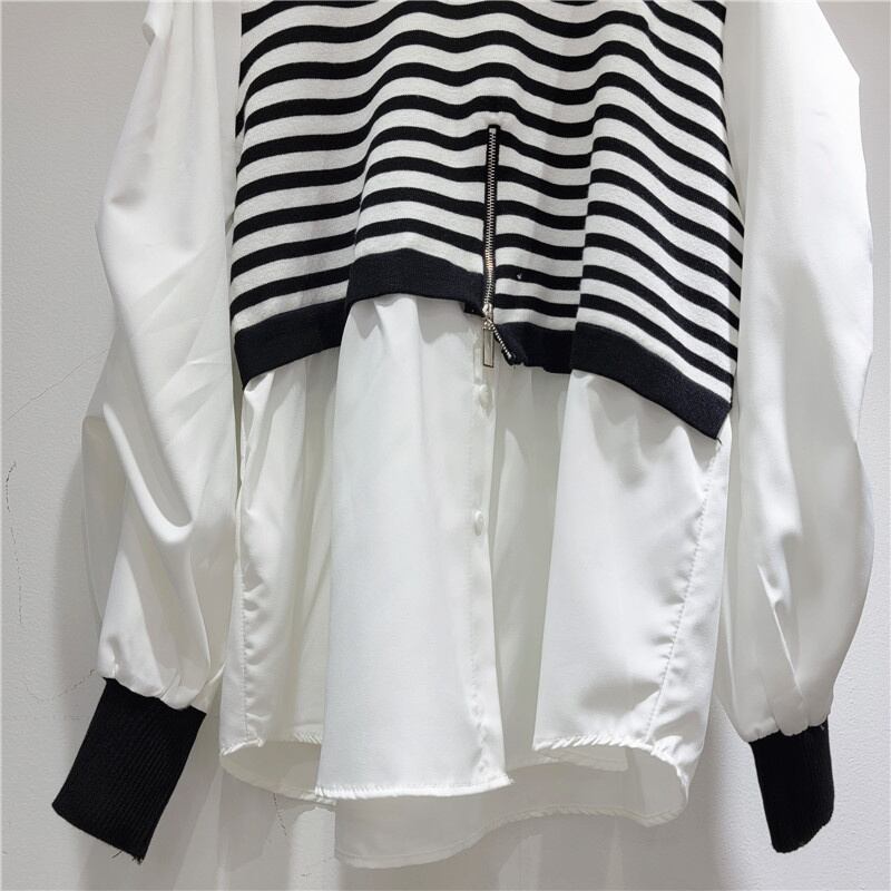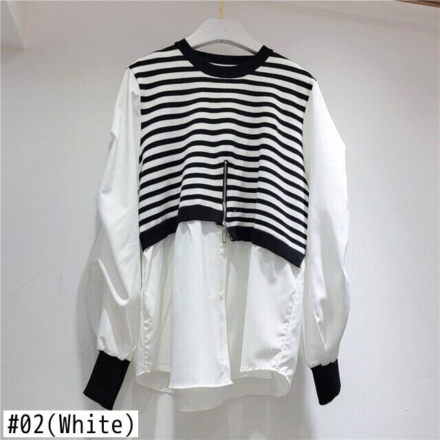 [EWQ] ニットスプライスストライプシャツ レディース 長袖 秋 フェイクツーピース トップス 大きいサイズ ブラウス 16U397 ロング オータム 秋物