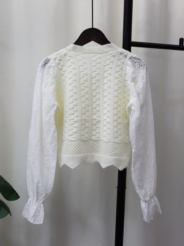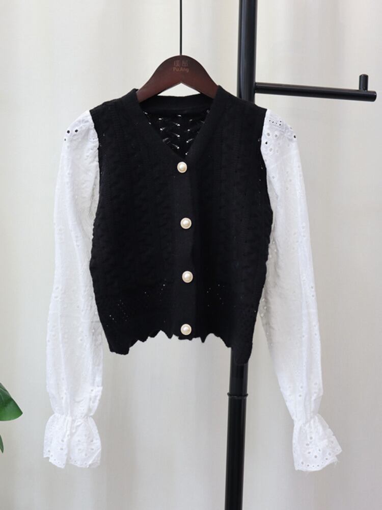 [EWQ] 長袖中空セーターカーディガンコートシングルブレストパッチワークコントラスト緩い薄い秋ニットジャケット ロング オータム 秋物