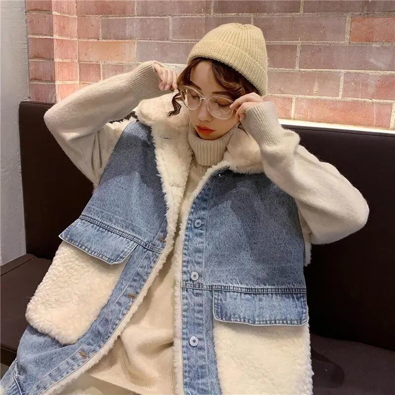 [EWQ] ラムヘア パッチワーク デニム ベスト ラペル 厚手 秋潮 ノースリーブ ジャケット 大きポケット チョッキ オータム 秋物