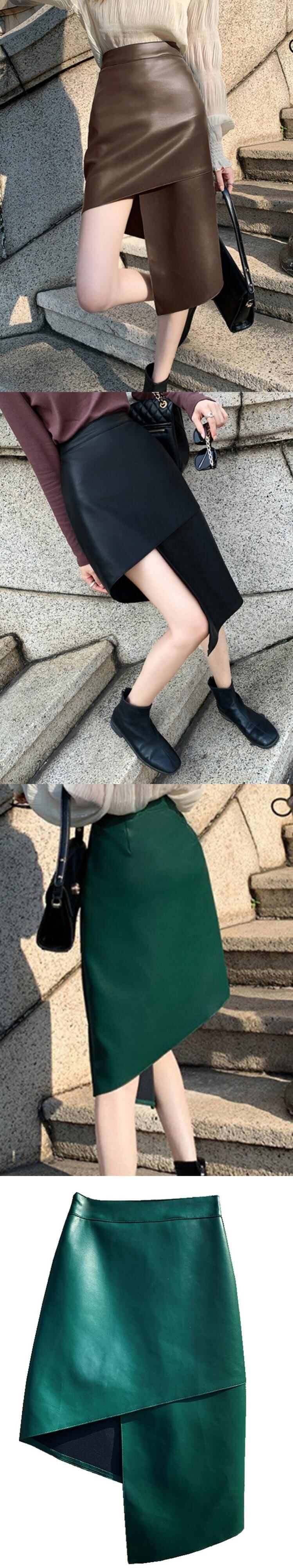 [EWQ] ウエストスリム不規則レザースカート潮秋非対称ラップヒップ PU ショートスカート 6U35 オータム 秋物