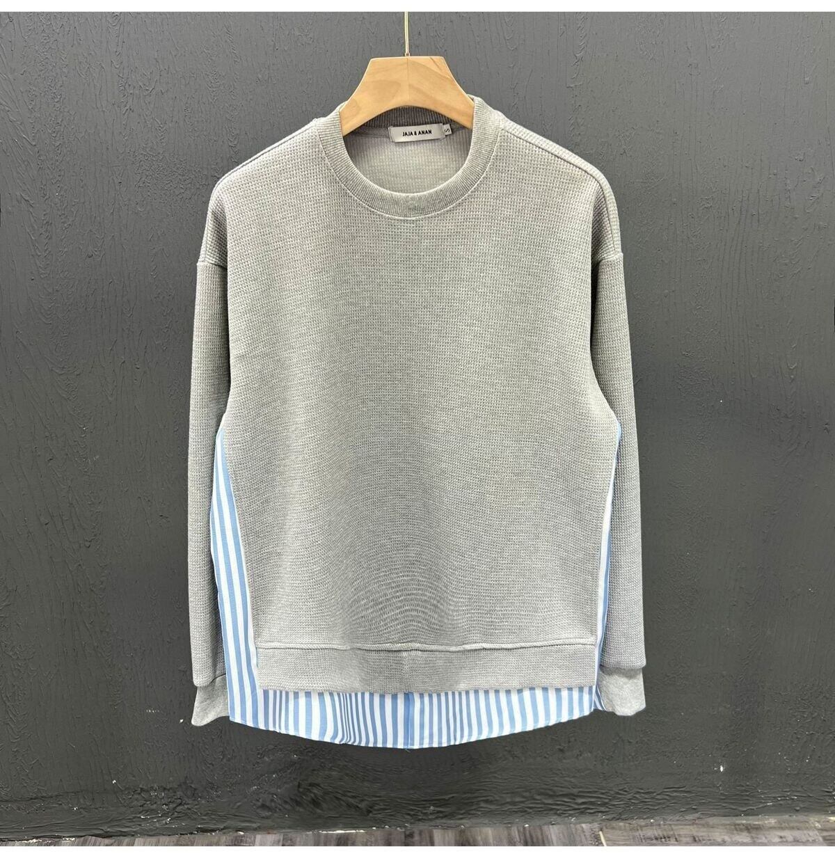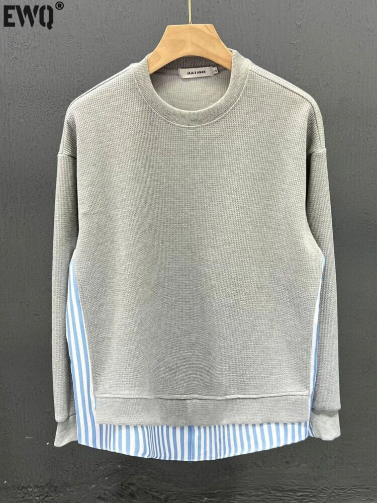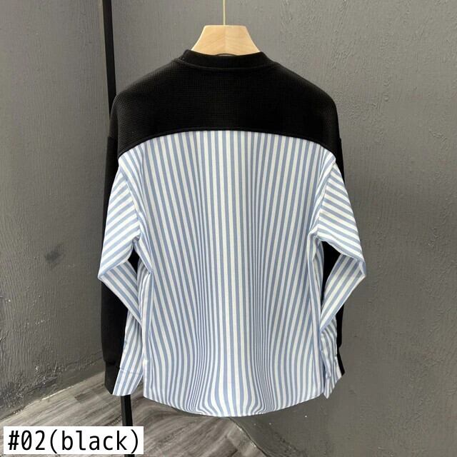 [EWQ] ストライプパッチワーク O ネックシャツ長袖ルーズブラウス秋コントラストカラートップス ロング オータム 秋物 Oネック